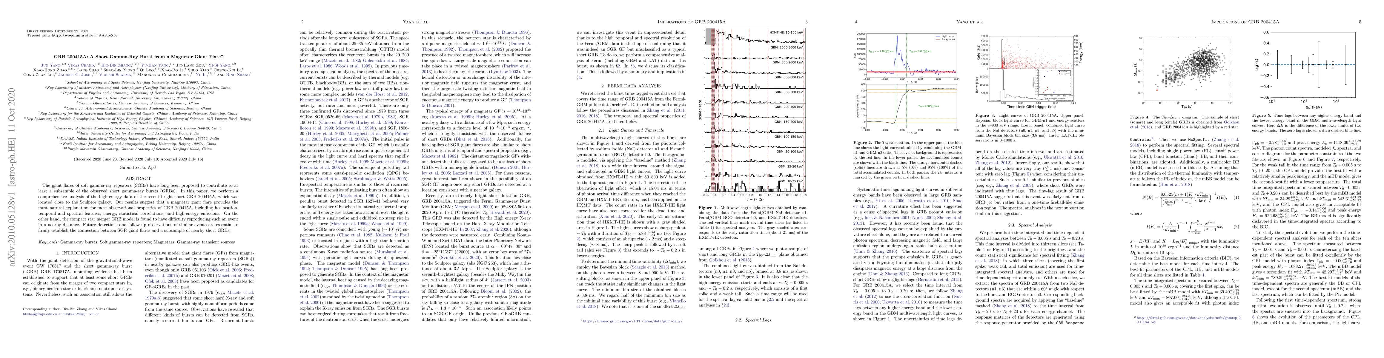 This paper analyzes the short gamma-ray burst GRB 200415A, suggesting it likely originated from a magnetar giant flare, based on its observational properties, rather than a compact star merger. Further observations are needed to confirm this connection.