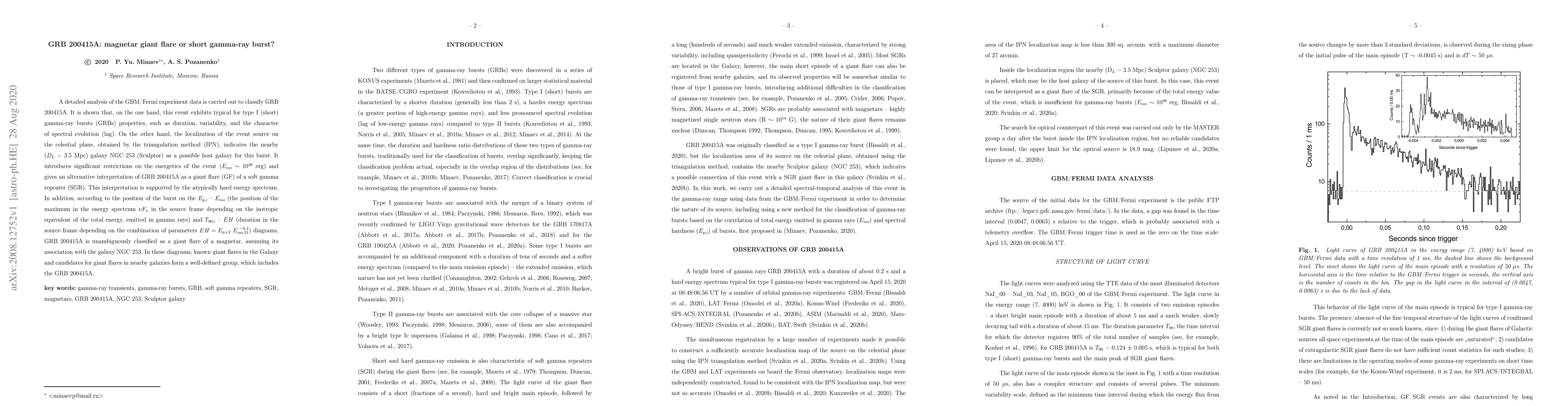 A detailed analysis of the GBM/Fermi experiment data is carried out to classify GRB 200415A. It is shown that, on the one hand, this event exhibits typical for type I (short) gamma-ray bursts (GRBs) properties, such as duration, variability, and the character of spectral evolution (lag). On the other hand, the localization of the event source on the celestial plane, obtained by the triangulation method (IPN), indicates the nearby ($ D_L $ = 3.5 Mpc) galaxy NGC 253 (Sculptor) as a possible host galaxy for this burst. It introduces significant restrictions on the energetics of the event ($ E_{iso} $ $ \sim $ $ 10^{46} $ erg) and gives an alternative interpretation of GRB 200415A as a giant flare (GF) of a soft gamma repeater (SGR). This interpretation is supported by the atypically hard energy spectrum. In addition, according to the position of the burst on the $ E_{p, i} $ -- $ E_{iso} $ (the position of the maximum in the energy spectrum $ \nu F_{\nu} $ in the source frame depending on the isotropic equivalent of the total energy, emitted in gamma rays) and $ T_{90, i} $ -- $ EH $ (duration in the source frame depending on the combination of parameters $ EH = E_{p,i,2} ~ E_{iso,51}^{ ~ -0.4} $) diagrams, GRB 200415A is unambiguously classified as a giant flare of a magnetar, assuming its association with the galaxy NGC 253. In these diagrams, known giant flares in the Galaxy and candidates for giant flares in nearby galaxies form a well-defined group, which includes the GRB 200415A.