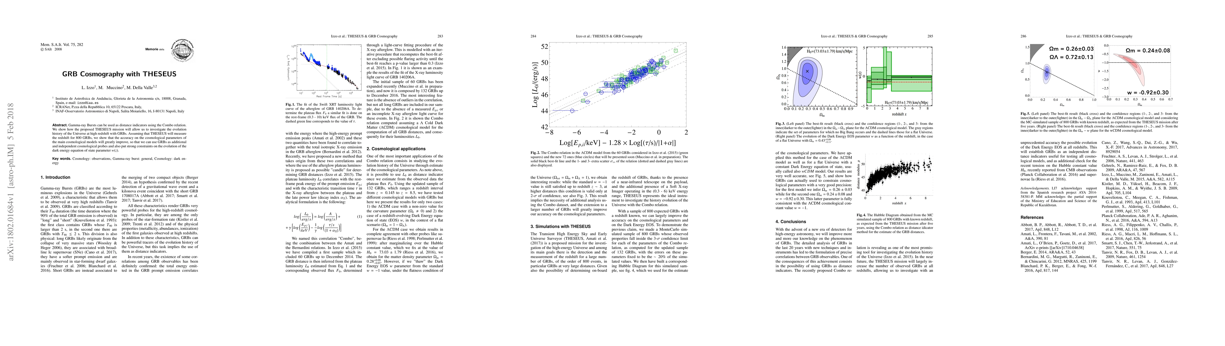 This paper explores using Gamma-ray Bursts (GRBs) as distance indicators to study the Universe's evolution at high redshifts via the Combo relation. The THESEUS mission is projected to measure the redshifts of 800 GRBs, significantly improving the accuracy of cosmological parameters and providing independent constraints on the dark energy equation of state parameter $w(z)$.