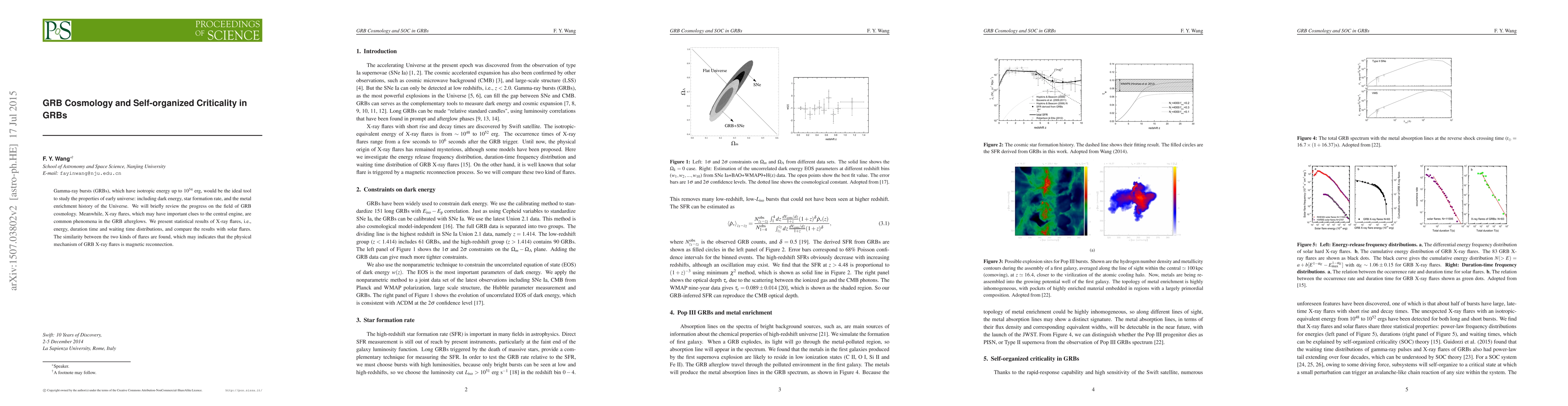 Gamma-ray bursts (GRBs), which have isotropic energy up to $10^{54}$ erg, would be the ideal tool to study the properties of early universe: including dark energy, star formation rate, and the metal enrichment history of the Universe. We will briefly review the progress on the field of GRB cosmology. Meanwhile, X-ray flares, which may have important clues to the central engine, are common phenomena in the GRB afterglows. We present statistical results of X-ray flares, i.e., energy, duration time and waiting time distributions, and compare the results with solar flares. The similarity between the two kinds of flares are found, which may indicates that the physical mechanism of GRB X-ray flares is magnetic reconnection.