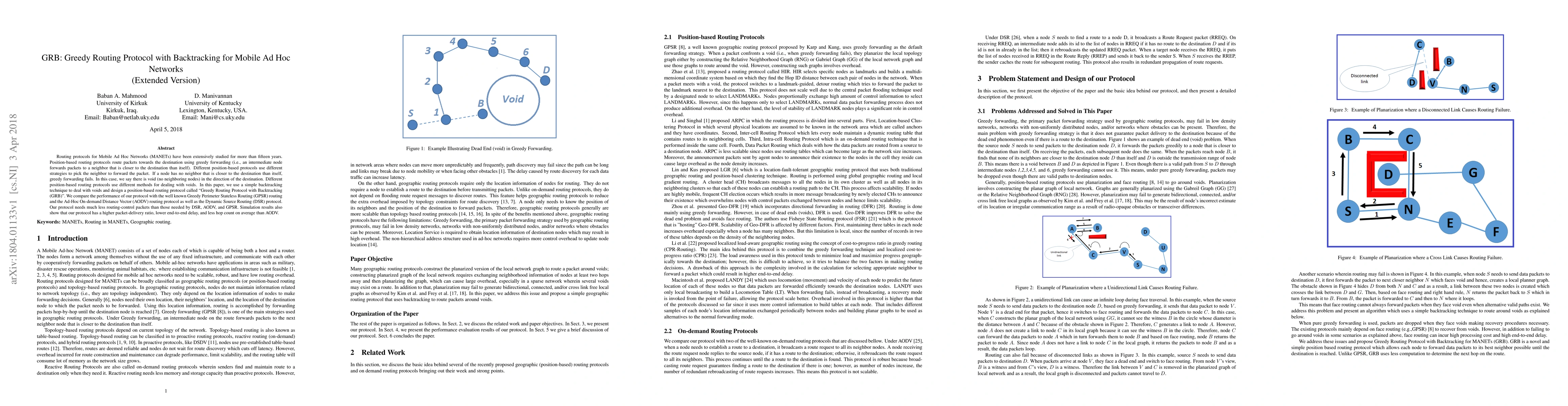 The paper introduces the Greedy Routing Protocol with Backtracking (GRB) for Mobile Ad Hoc Networks (MANETs), which uses a backtracking technique to handle voids in greedy forwarding. The GRB protocol performs better than GPSR, AODV, and DSR in terms of routing-control packets, packet-delivery ratio, end-to-end delay, and average hop count.