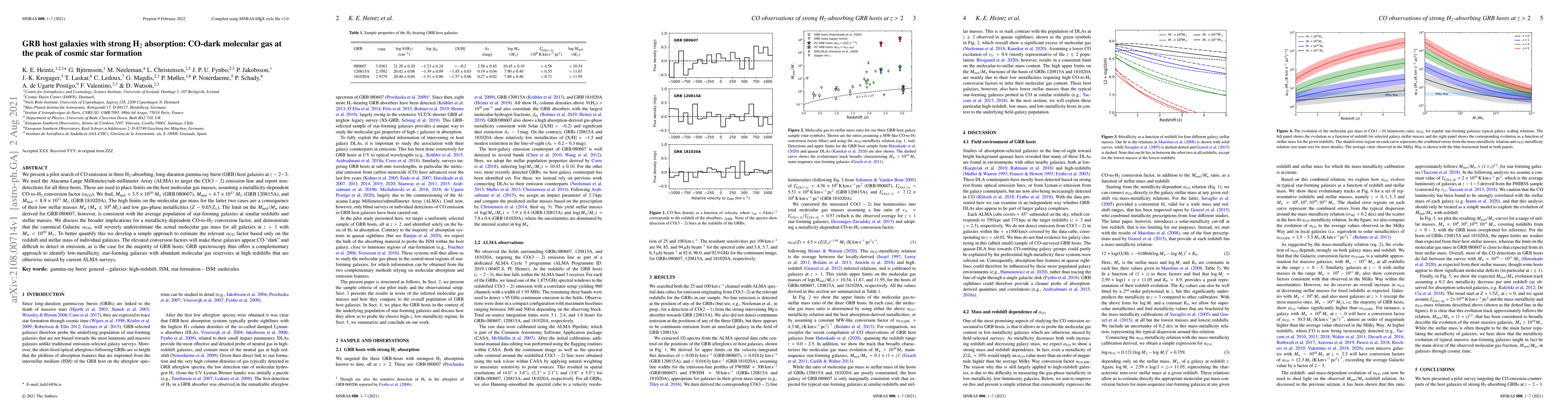 We present a pilot search of CO emission in three H$_2$-absorbing, long-duration gamma-ray burst (GRB) host galaxies at z~2-3. We used the Atacama Large Millimeter/sub-millimeter Array (ALMA) to target the CO(3-2) emission line and report non-detections for all three hosts. These are used to place limits on the host molecular gas masses, assuming a metallicity-dependent CO-to-H$_2$ conversion factor ($\alpha_{\rm CO}$). We find, $M_{\rm mol} < 3.5\times 10^{10}\,M_{\odot}$ (GRB\,080607), $M_{\rm mol} < 4.7\times 10^{11}\,M_{\odot}$ (GRB\,120815A), and $M_{\rm mol} < 8.9\times 10^{11}\,M_{\odot}$ (GRB\,181020A). The high limits on the molecular gas mass for the latter two cases are a consequence of their low stellar masses $M_\star$ ($M_\star \lesssim 10^{8}\,M_{\odot}$) and low gas-phase metallicities ($Z\sim 0.03\,Z_{\odot}$). The limit on the $M_{\rm mol}/M_\star$ ratio derived for GRB\,080607, however, is consistent with the average population of star-forming galaxies at similar redshifts and stellar masses. We discuss the broader implications for a metallicity-dependent CO-to-H$_2$ conversion factor, and demonstrate that the canonical Galactic $\alpha_{\rm CO}$, will severely underestimate the actual molecular gas mass for all galaxies at $z>1$ with $M_\star < 10^{10}\,M_\odot$. To better quantify this we develop a simple approach to estimate the relevant $\alpha_{\rm CO}$ factor based only on the redshift and stellar mass of individual galaxies. The elevated conversion factors will make these galaxies appear CO-"dark" and difficult to detect in emission, as is the case for the majority of GRB hosts. GRB spectroscopy thus offers a complementary approach to identify low-metallicity, star-forming galaxies with abundant molecular gas reservoirs at high redshifts that are otherwise missed by current ALMA surveys.