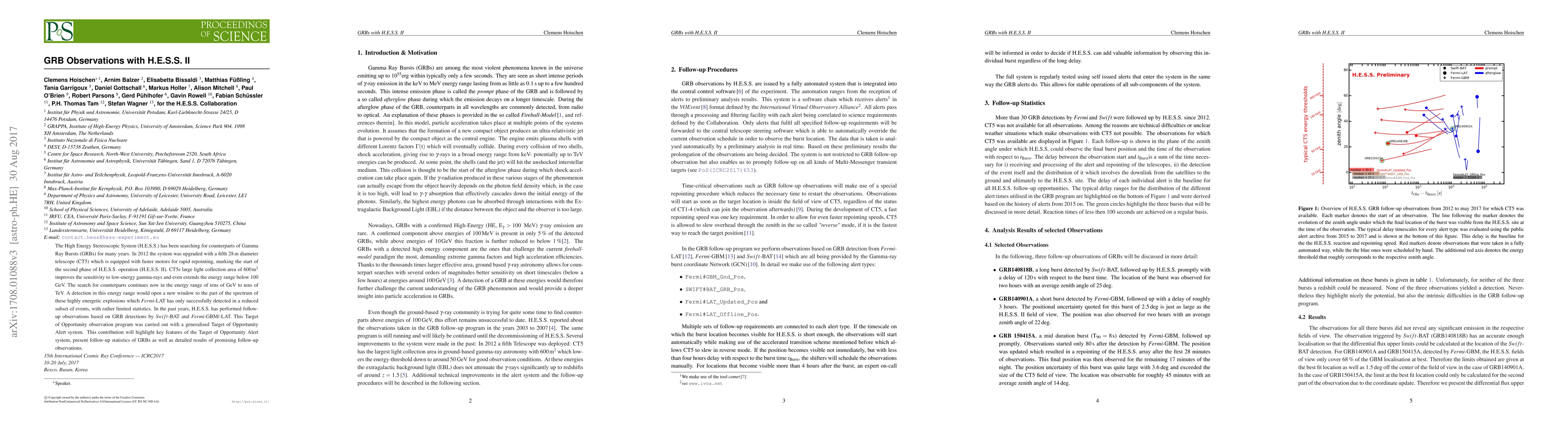 The High Energy Stereoscopic System (H.E.S.S.) has been searching for counterparts of Gamma Ray Bursts (GRBs) for many years. In 2012 the system was upgraded with a fifth $28$ m diameter telescope (CT5) which is equipped with faster motors for rapid repointing, marking the start of the second phase of H.E.S.S. operation (H.E.S.S. II). CT5s large light collection area of $600\,{\rm m}^{2}$ improves the sensitivity to low-energy gamma-rays and even extends the energy range below $100$ GeV. The search for counterparts continues now in the energy range of tens of GeV to tens of TeV. A detection in this energy range would open a new window to the part of the spectrum of these highly energetic explosions which Fermi-LAT has only successfully detected in a reduced subset of events, with rather limited statistics. In the past years, H.E.S.S. has performed followup observations based on GRB detections by Swift-BAT and Fermi-GBM/-LAT. This Target of Opportunity observation program was carried out with a generalised Target of Opportunity Alert system. This contribution will highlight key features of the Target of Opportunity Alert system, present follow-up statistics of GRBs as well as detailed results of promising follow-up observations.