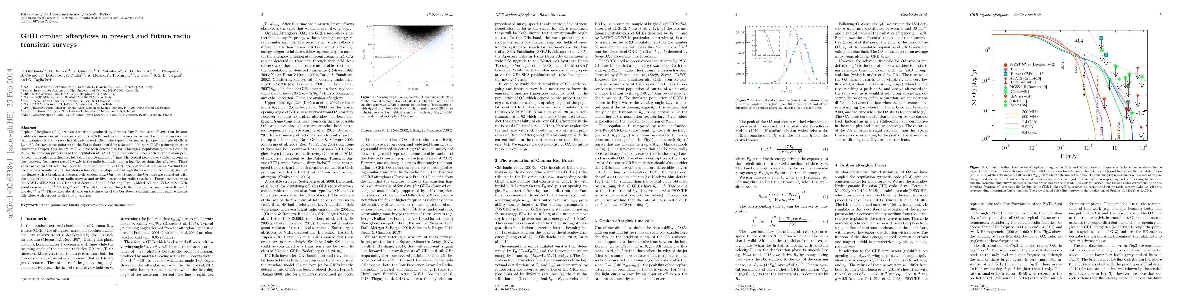Orphan Afterglows (OA) are slow transients produced by Gamma Ray Bursts seen off-axis that become visible on timescales of days/years at optical/NIR and radio frequencies, when the prompt emission at high energies (X and gamma rays) has already ceased. Given the typically estimated jet opening angle of GRBs theta_jet ~ 3 deg, for each burst pointing to the Earth there should be a factor ~ 700 more GRBs pointing in other directions. Despite this, no secure OAs have been detected so far. Through a population synthesis code we study the emission properties of the population of OA at radio frequencies. OAs reach their emission peak on year-timescales and they last for a comparable amount of time. The typical peak fluxes (which depend on the observing frequency) are of few micro Jy in the radio band with only a few OA reaching the mJy level. These values are consistent with the upper limits on the radio flux of SN Ib/c observed at late times. We find that the OA radio number count distribution has a typical slope -1.7 at high fluxes and a flatter (-0.4) slope at low fluxes with a break at a frequency-dependent flux. Our predictions of the OA rates are consistent with the (upper) limits of recent radio surveys and archive searches for radio transients. Future radio surveys like VAST/ASKAP at 1.4 GHz should detect ~ 3x10^-3 OA deg^-2 yr-1, MeerKAT and EVLA at 8.4 GHz should see ~ 3x10^-1 OA deg-2 yr-1. The SKA, reaching the micro Jy flux limit, could see up to ~ 0.2-1.5 OA deg^-2 yr^-1. These rates also depend on the duration of the OA above a certain flux limit and we discuss this effect with respect to the survey cadence.