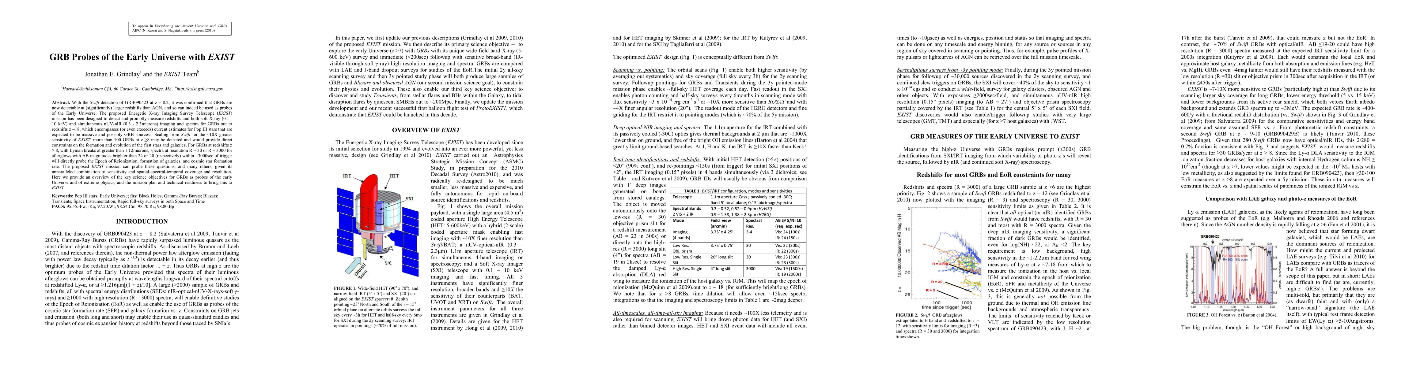 With the Swift detection of GRB090423 at z = 8.2, it was confirmed that GRBs are now detectable at (significantly) larger redshifts than AGN, and so can indeed be used as probes of the Early Universe. The proposed Energetic X-ray Imaging Survey Telescope (EXIST) mission has been designed to detect and promptly measure redshifts and both soft X-ray (0.1 - 10 keV) and simultaneous nUV-nIR (0.3 - 2.3microns) imaging and spectra for GRBs out to redshifts z ~18, which encompasses (or even exceeds) current estimates for Pop III stars that are expected to be massive and possibly GRB sources. Scaling from Swift for the ~10X greater sensitivity of EXIST, more than 100 GRBs at z >=8 may be detected and would provide direct constraints on the formation and evolution of the first stars and galaxies. For GRBs at redshifts z >= 8, with Lyman breaks at greater than 1.12microns, spectra at resolution R = 30 or R = 3000 for afterglows with AB magnitudes brighter than 24 or 20 (respectively) within ~3000sec of trigger will directly probe the Epoch of Reionization, formation of galaxies, and cosmic star formation rate. The proposed EXIST mission can probe these questions, and many others, given its unparalleled combination of sensitivity and spatial-spectral-temporal coverage and resolution. Here we provide an overview of the key science objectives for GRBs as probes of the early Universe and of extreme physics, and the mission plan and technical readiness to bring this to EXIST.