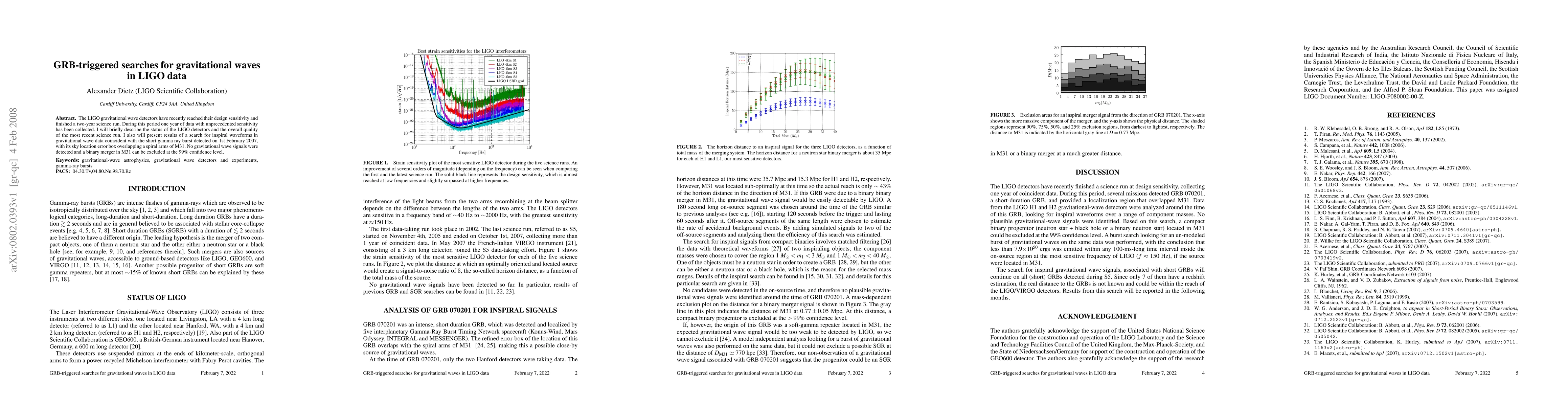 The LIGO gravitational wave detectors have recently reached their design sensitivity and finished a two-year science run. During this period one year of data with unprecedented sensitivity has been collected. I will briefly describe the status of the LIGO detectors and the overall quality of the most recent science run. I also will present results of a search for inspiral waveforms in gravitational wave data coincident with the short gamma ray burst detected on 1st February 2007, with its sky location error box overlapping a spiral arms of M31. No gravitational wave signals were detected and a binary merger in M31 can be excluded at the 99% confidence level.
