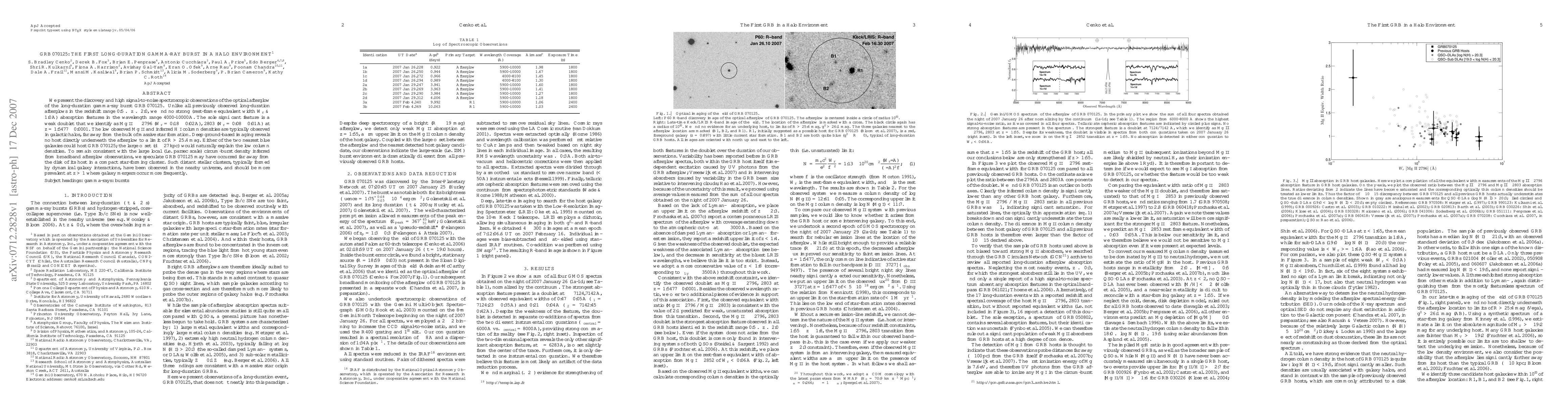 The paper presents the discovery of the optical afterglow for GRB070125, a long-duration gamma-ray burst. Unlike other bursts, it shows weak Mg II absorption lines with no strong features, suggesting it's located in a galactic halo rather than a star-formation region. The burst's host galaxy isn't directly visible beneath the afterglow, and it's hypothesized that the burst might have occurred in a compact, distant star-forming cluster, possibly formed by galaxy interactions, which are more common at high redshifts.
