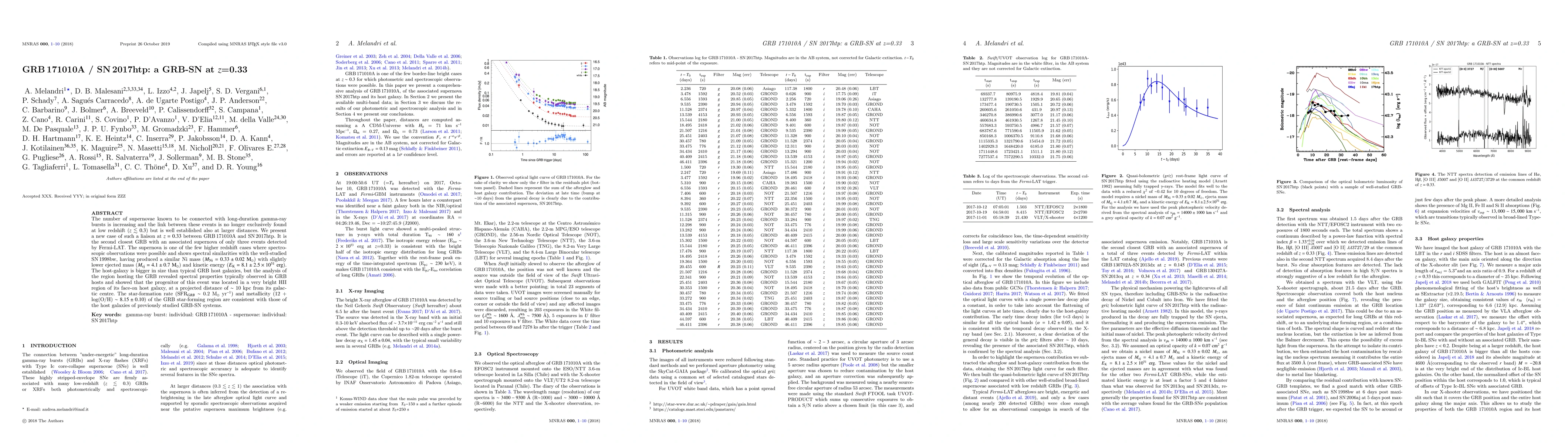 The number of supernovae known to be connected with long-duration gamma-ray bursts is increasing and the link between these events is no longer exclusively found at low redshift ($z \lesssim 0.3$) but is well established also at larger distances. We present a new case of such a liaison at $z = 0.33$ between GRB\,171010A and SN\,2017htp. It is the second closest GRB with an associated supernova of only three events detected by Fermi-LAT. The supernova is one of the few higher redshift cases where spectroscopic observations were possible and shows spectral similarities with the well-studied SN\,1998bw, having produced a similar Ni mass ($M_{\rm Ni}=0.33\pm0.02 ~\rm{M_{\odot}}$) with slightly lower ejected mass ($M_{\rm ej}=4.1\pm0.7~\rm{M_{\odot}}$) and kinetic energy ($E_{\rm K} = 8.1\pm2.5 \times 10^{51} ~\rm{erg}$). The host-galaxy is bigger in size than typical GRB host galaxies, but the analysis of the region hosting the GRB revealed spectral properties typically observed in GRB hosts and showed that the progenitor of this event was located in a very bright HII region of its face-on host galaxy, at a projected distance of $\sim$ 10 kpc from its galactic centre. The star-formation rate (SFR$_{GRB} \sim$ 0.2 M$_{\odot}$~yr$^{-1}$) and metallicity (12 + log(O/H) $\sim 8.15 \pm 0.10$) of the GRB star-forming region are consistent with those of the host galaxies of previously studied GRB-SN systems.