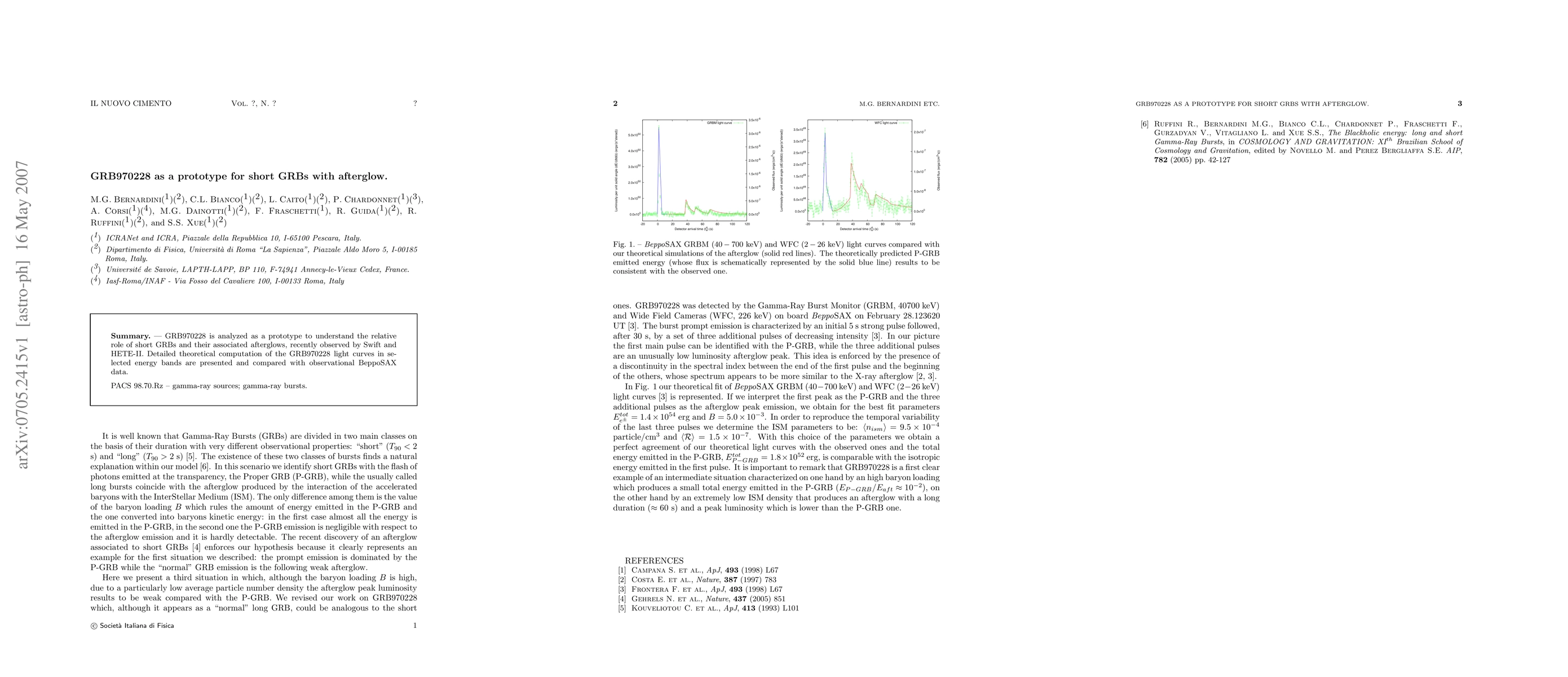 GRB970228 is analyzed as a prototype to understand the relative role of short GRBs and their associated afterglows, recently observed by Swift and HETE-II. Detailed theoretical computation of the GRB970228 light curves in selected energy bands are presented and compared with observational BeppoSAX data.