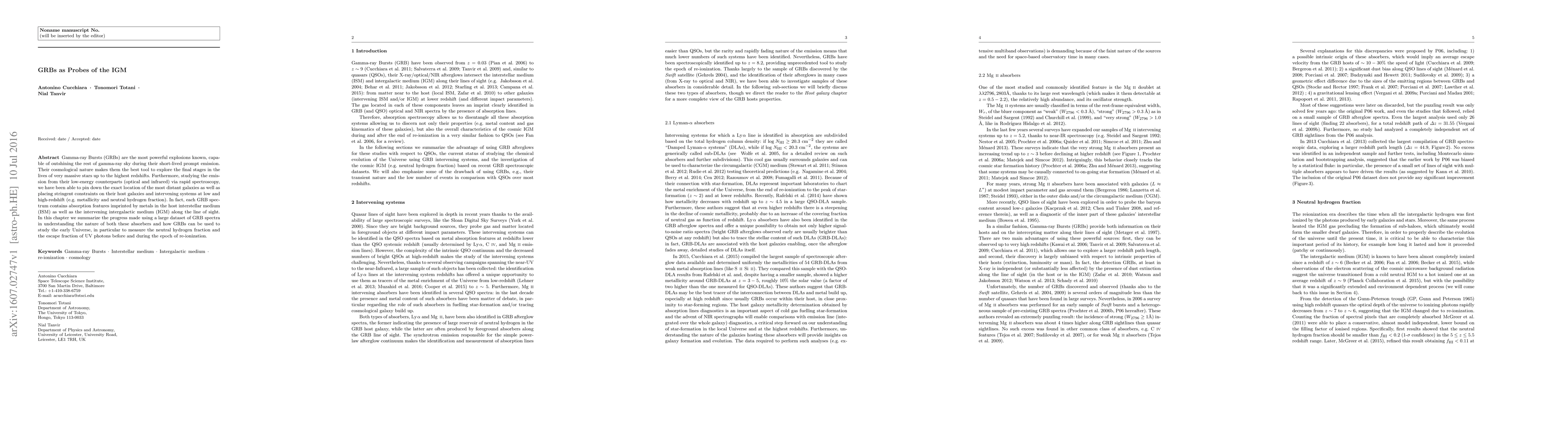 Gamma-ray Bursts (GRBs) are the most powerful explosions known, capable of outshining the rest of gamma-ray sky during their short-lived prompt emission. Their cosmological nature makes them the best tool to explore the final stages in the lives of very massive stars up to the highest redshifts. Furthermore, studying the emission from their low-energy counterparts (optical and infrared) via rapid spectroscopy, we have been able to pin down the exact location of the most distant galaxies as well as placing stringent constraints on their host galaxies and intervening systems at low and high-redshift (e.g. metallicity and neutral hydrogen fraction). In fact, each GRB spectrum contains absorption features imprinted by metals in the host interstellar medium (ISM) as well as the intervening intergalactic medium (IGM) along the line of sight. In this chapter we summarize the progress made using a large dataset of GRB spectra in understanding the nature of both these absorbers and how GRBs can be used to study the early Universe, in particular to measure the neutral hydrogen fraction and the escape fraction of UV photons before and during the epoch of re-ionization.