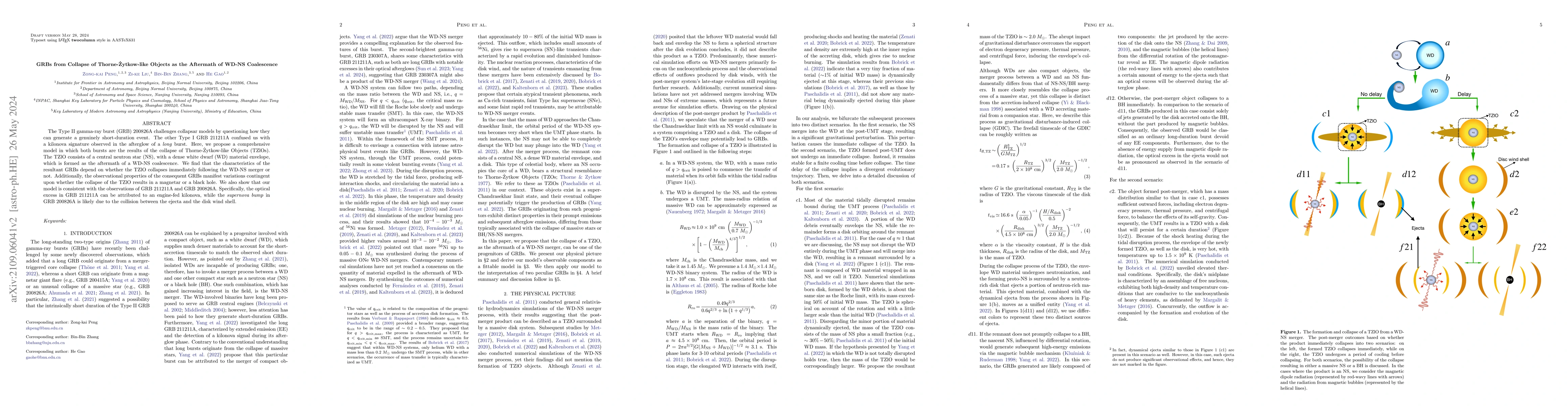 This research proposes a new model explaining the origins of short-duration GRBs 200826A and 211211A through the collapse of Thorne-Zytkow-like Objects (TZlOs) formed post-WD-NS coalescence. The model accounts for variations in GRB characteristics and observational properties based on whether the TZlO collapses into a magnetar or a black hole, aligning well with the observed traits of the two GRBs.