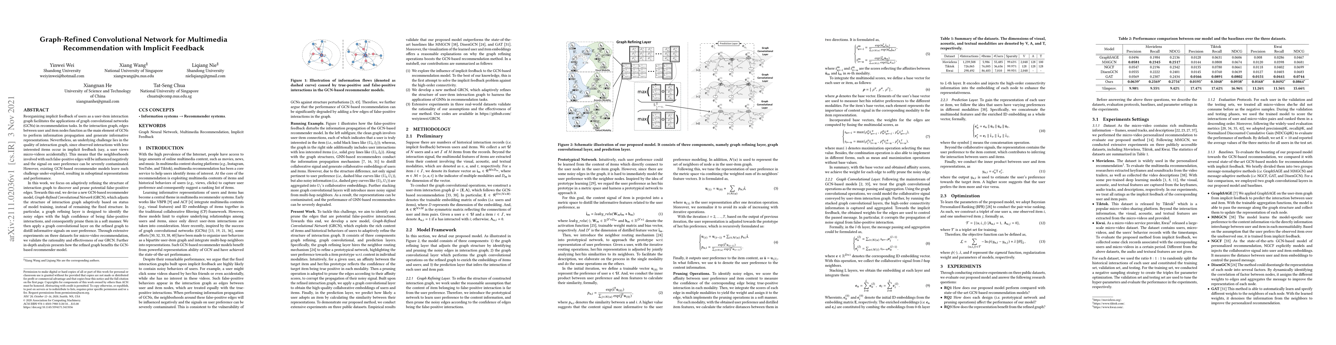 The paper introduces GRCN, a Graph-Refined Convolutional Network for multimedia recommendation using implicit feedback, which adaptively refines user-item interaction graphs to identify and prune false-positive edges, thereby improving the quality of user preference representations and enhancing recommendation performance. Experimental results on micro-video datasets demonstrate the effectiveness of the proposed graph refinement method.