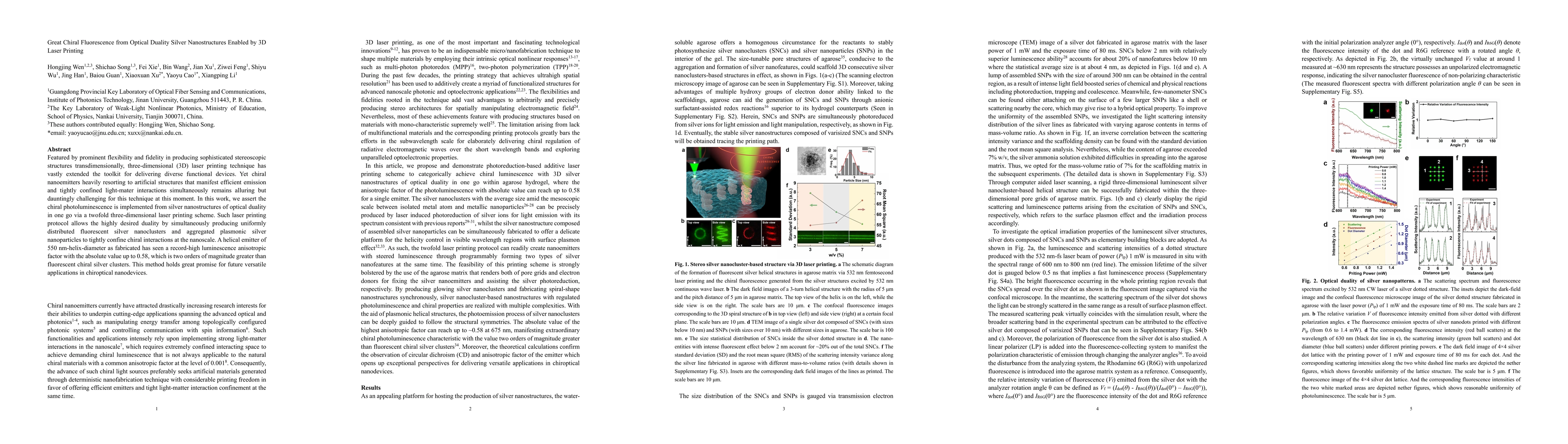 This paper demonstrates a 3D laser printing technique to fabricate silver nanostructures that exhibit chiral fluorescence through optical duality, achieving a record-high luminescence anisotropic factor of up to 0.58. The method combines fluorescent silver nanoclusters and plasmonic nanoparticles to tightly confine chiral interactions, showing potential for advanced chiroptical nanodevices.