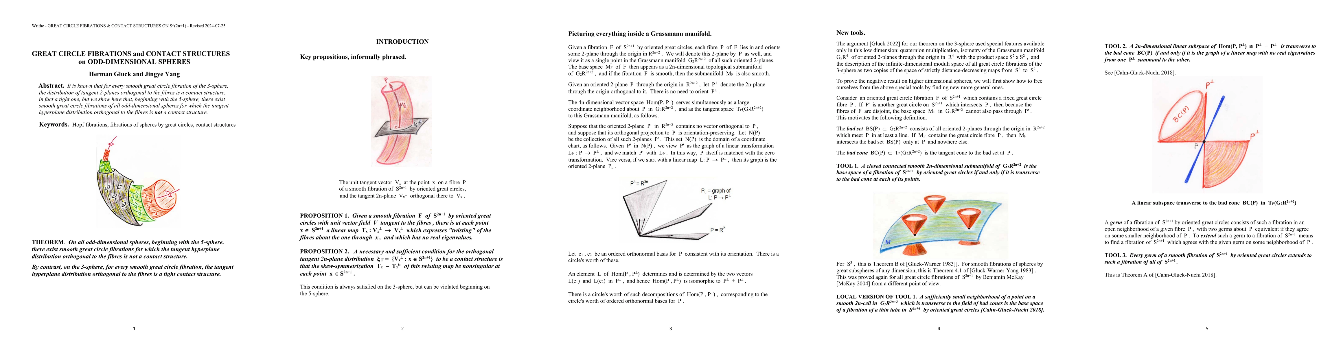 This paper investigates smooth great circle fibrations on odd-dimensional spheres, proving that while such fibrations on the 3-sphere yield tight contact structures, for spheres of dimension 5 and higher, not all such fibrations result in contact structures.