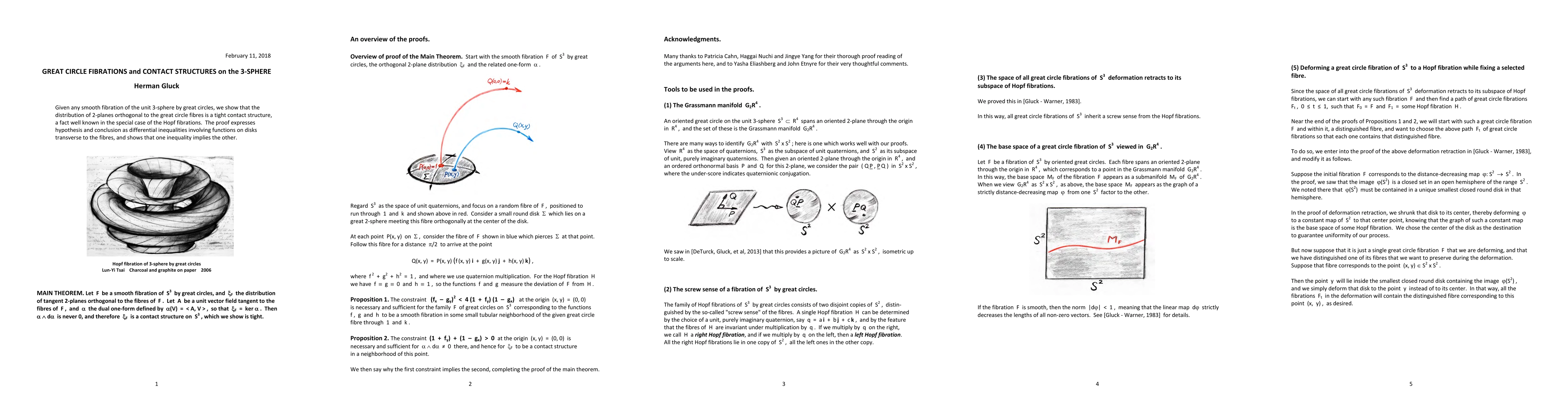 Given any smooth fibration of the unit 3-sphere by great circles, we show that the distribution of 2-planes orthogonal to the great circle fibres is a tight contact structure, a fact well known in the special case of the Hopf fibrations. The proof expresses hypothesis and conclusion as differential inequalities involving functions on disks transverse to the fibres, and shows that one inequality implies the other.