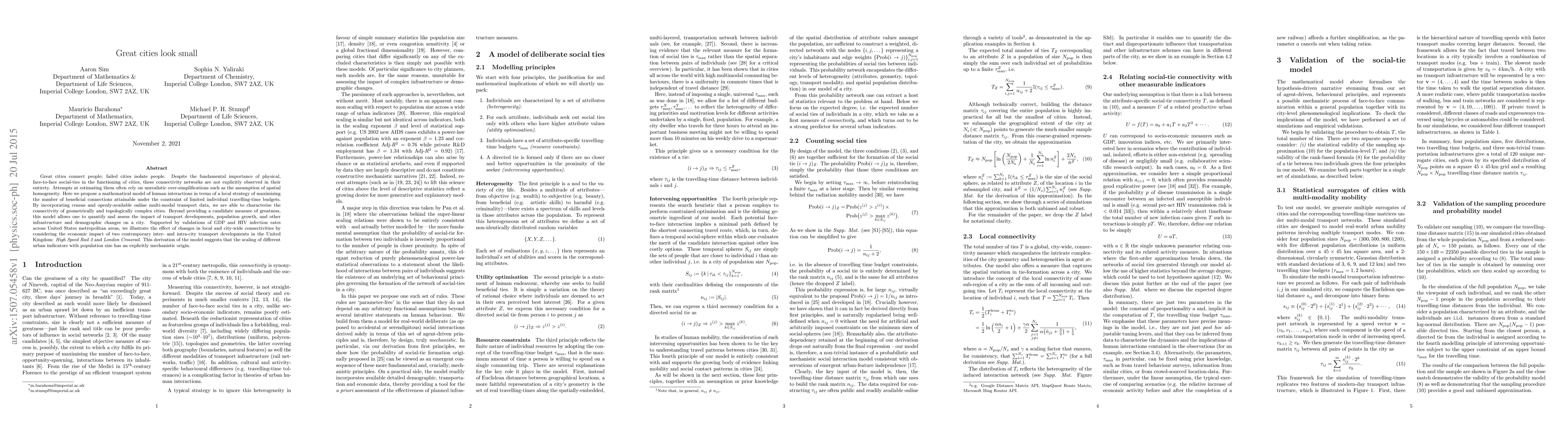 Great cities connect people; failed cities isolate people. Despite the fundamental importance of physical, face-to-face social-ties in the functioning of cities, these connectivity networks are not explicitly observed in their entirety. Attempts at estimating them often rely on unrealistic over-simplifications such as the assumption of spatial homogeneity. Here we propose a mathematical model of human interactions in terms of a local strategy of maximising the number of beneficial connections attainable under the constraint of limited individual travelling-time budgets. By incorporating census and openly-available online multi-modal transport data, we are able to characterise the connectivity of geometrically and topologically complex cities. Beyond providing a candidate measure of greatness, this model allows one to quantify and assess the impact of transport developments, population growth, and other infrastructure and demographic changes on a city. Supported by validations of GDP and HIV infection rates across United States metropolitan areas, we illustrate the effect of changes in local and city-wide connectivities by considering the economic impact of two contemporary inter- and intra-city transport developments in the United Kingdom: High Speed Rail 2 and London Crossrail. This derivation of the model suggests that the scaling of different urban indicators with population size has an explicitly mechanistic origin.
