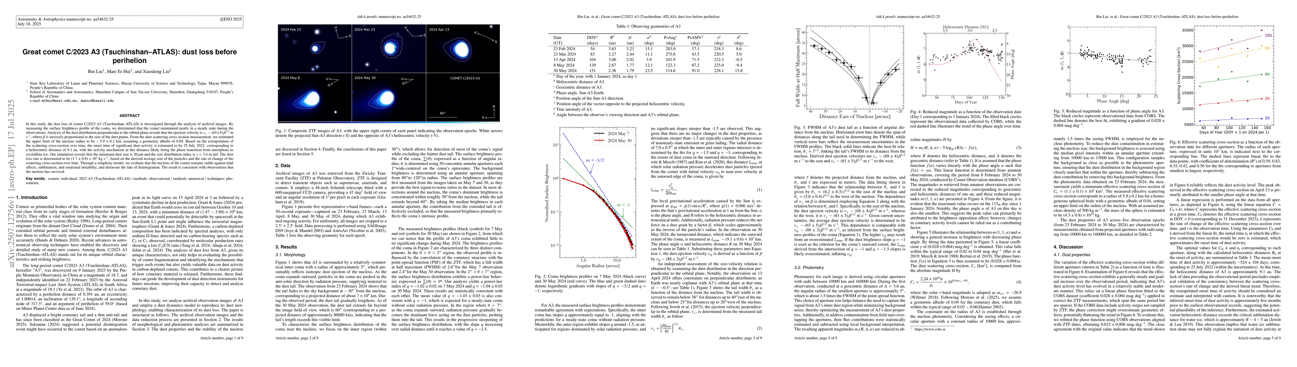 In this study, the dust loss of comet C/2023 A3 (Tsuchinshan-ATLAS) is investigated through the analysis of archival images. By measuring the surface brightness profile of the coma, we determined that the comet maintained nearly in a steady state during the observations. Analysis of the dust distribution perpendicular to the orbital plane reveals that the ejection velocity is $v_{\perp}\sim(65\pm5)\,\beta^{1/2}$ m s$^{-1}$, where $\beta$ is inversely proportional to the size of the dust grains. From the dust scattering cross-section measurement, we estimated the upper limit of the nucleus radius to be $\sim\!5.9\pm0.2$ km, assuming a geometric albedo of 0.04. Based on the extrapolation of the scattering cross-section over time, the onset time of significant dust activity is estimated to be 25 July 2022, corresponding to a heliocentric distance of 9.1 au, with the activity mechanism at this distance likely being the phase transition from amorphous to crystalline ice. Our simulation reveals that the minimum dust size is \SI{20}{\micro\meter} and the size distribution index is $s = 3.4$ in tail. The dust loss rate is determined to be $(1.7 \pm 0.8) \times 10^2$ kg s$^{-1}$, based on the derived average size of the particles and the rate of change of the scattering cross-section over time. Through a simplistic model, we evaluate that the nucleus of the comet remains stable against tidal effects, sublimation, and rotational instability, and disfavour the fate of disintegration. The result is consistent with observations that the nucleus has survived.