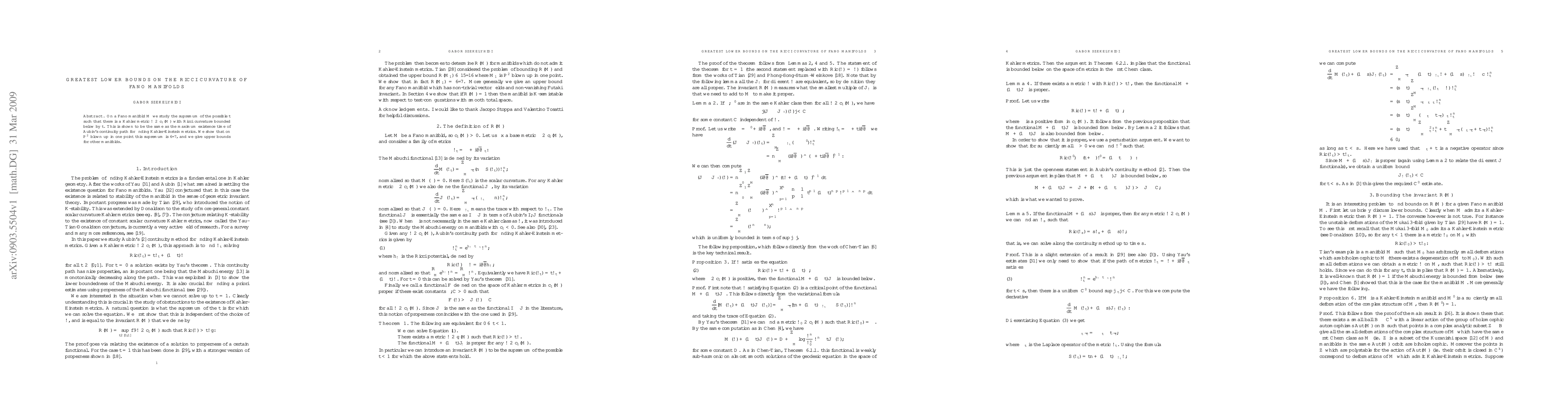 This paper investigates the greatest lower bounds of Ricci curvature for Fano manifolds, demonstrating that this bound equals the maximum existence time for Aubin's continuity path in finding Kähler-Einstein metrics. Specifically, it finds that the supremum for the projective plane blown up at one point is 6/7, and provides upper bounds for other Fano manifolds.