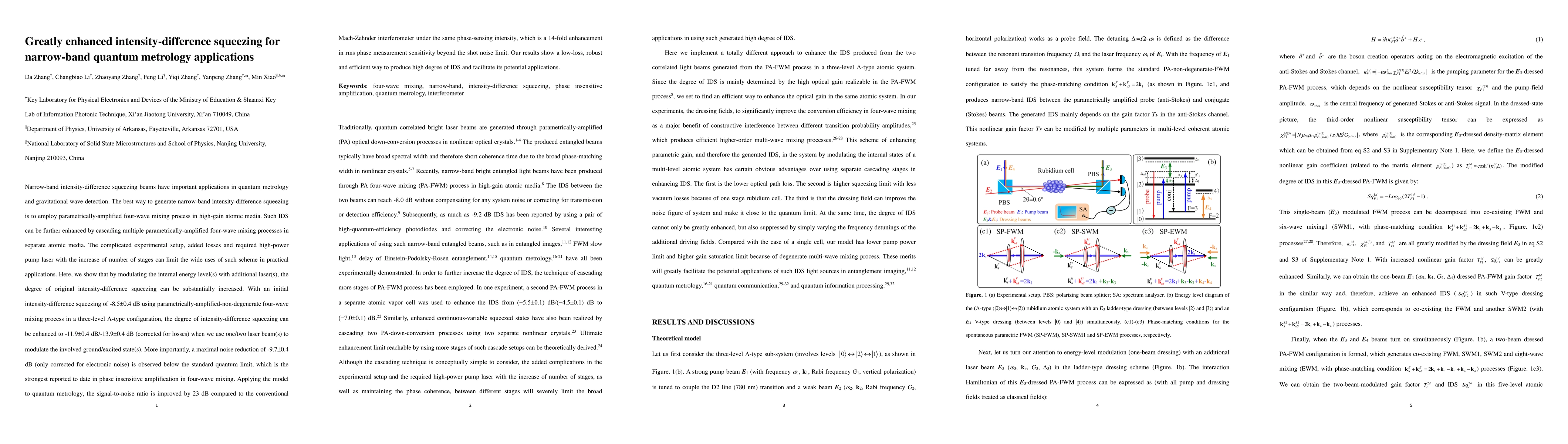 Narrow-band intensity-difference squeezing beams have important applications in quantum metrology and gravitational wave detection. The best way to generate narrow-band intensity-difference squeezing is to employ parametrically-amplified four-wave mixing process in high-gain atomic media. Such IDS can be further enhanced by cascading multiple parametrically-amplified four-wave mixing processes in separate atomic media. The complicated experimental setup, added losses and required high-power pump laser with the increase of number of stages can limit the wide uses of such scheme in practical applications. Here, we show that by modulating the internal energy level(s) with additional laser(s), the degree of original intensity-difference squeezing can be substantially increased. With an initial intensity-difference squeezing of $-8.5\pm0.4$ dB using parametrically-amplified-non-degenerate four-wave mixing process in a three-level $\Lambda$-type configuration, the degree of intensity-difference squeezing can be enhanced to $-11.9\pm0.4$ dB/$-13.9\pm0.4$ dB (corrected for losses) when we use one/two laser beam(s) to modulate the involved ground/excited state(s). More importantly, a maximal noise reduction of $-9.7\pm0.4$ dB (only corrected for electronic noise) is observed below the standard quantum limit, which is the strongest reported to date in phase insensitive amplification in four-wave mixing. Applying the model to quantum metrology, the signal-to-noise ratio is improved by 23 dB compared to the conventional Mach-Zehnder interferometer under the same phase-sensing intensity, which is a 14-fold enhancement in rms phase measurement sensitivity beyond the shot noise limit. Our results show a low-loss, robust and efficient way to produce high degree of IDS and facilitate its potential applications.