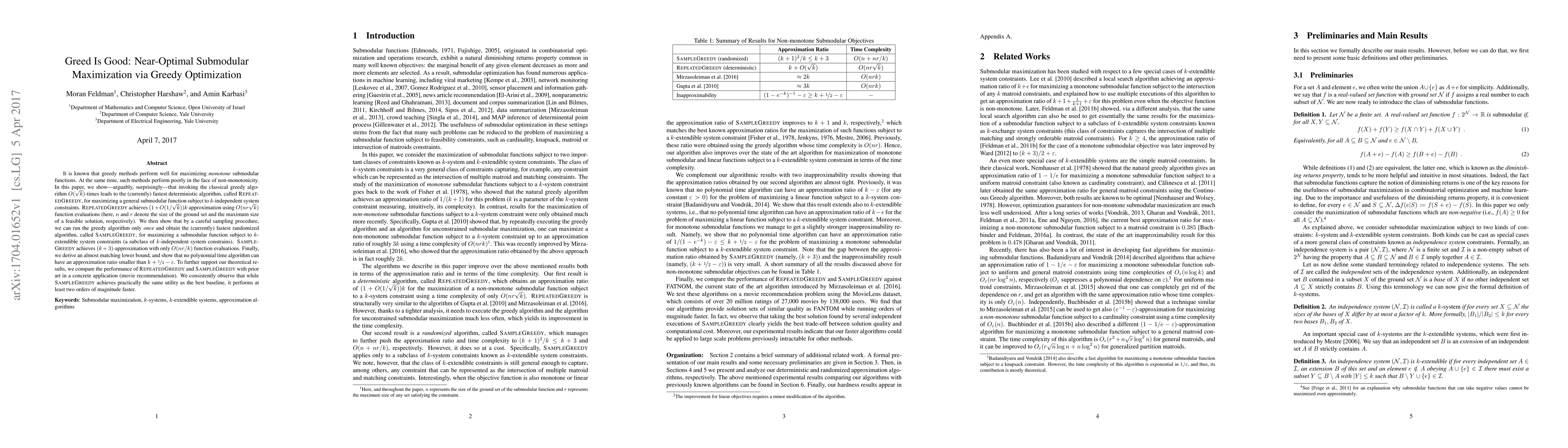 This paper presents Repeated Greedy and Sample Greedy algorithms that, by invoking a classical greedy algorithm multiple times, achieve near-optimal approximation for maximizing general submodular functions under specific constraints. Repeated Greedy provides a (1 + O(1/sqrt(k)))k approximation with O(nr√k) function evaluations for k-independent systems. Sample Greedy, a randomized method, offers (k + 3)-approximation using only O(nr/k) function evaluations for k-extendible systems. Theoretical analysis and movie recommendation application demonstrate the superior performance and efficiency of these algorithms compared to prior methods.