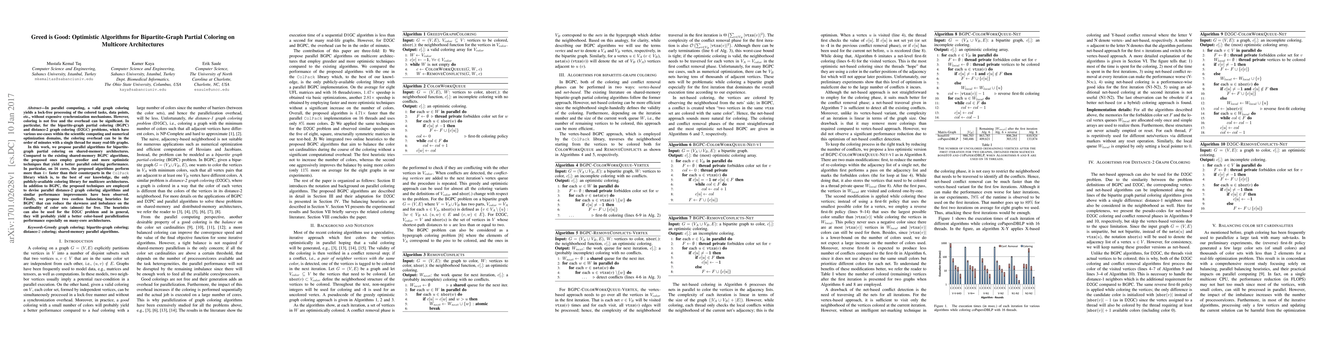 This research introduces optimistic, greedier parallel algorithms for bipartite-graph partial coloring on multicore architectures, significantly outperforming existing methods by over 4 times on 16 cores. The techniques also improve distance-2 graph coloring performance and propose costless balancing heuristics to reduce skewness and imbalance in color set cardinalities, benefiting parallelization on many-core systems.