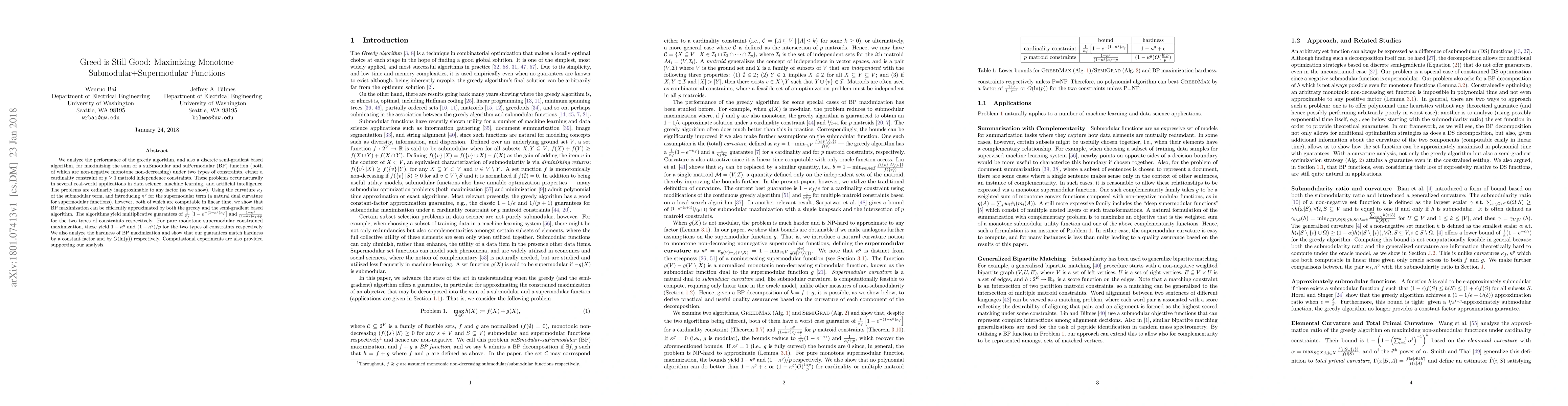 We analyze the performance of the greedy algorithm, and also a discrete semi-gradient based algorithm, for maximizing the sum of a suBmodular and suPermodular (BP) function (both of which are non-negative monotone non-decreasing) under two types of constraints, either a cardinality constraint or $p\geq 1$ matroid independence constraints. These problems occur naturally in several real-world applications in data science, machine learning, and artificial intelligence. The problems are ordinarily inapproximable to any factor (as we show). Using the curvature $\kappa_f$ of the submodular term, and introducing $\kappa^g$ for the supermodular term (a natural dual curvature for supermodular functions), however, both of which are computable in linear time, we show that BP maximization can be efficiently approximated by both the greedy and the semi-gradient based algorithm. The algorithms yield multiplicative guarantees of $\frac{1}{\kappa_f}\left[1-e^{-(1-\kappa^g)\kappa_f}\right]$ and $\frac{1-\kappa^g}{(1-\kappa^g)\kappa_f + p}$ for the two types of constraints respectively. For pure monotone supermodular constrained maximization, these yield $1-\kappa^g$ and $(1-\kappa^g)/p$ for the two types of constraints respectively. We also analyze the hardness of BP maximization and show that our guarantees match hardness by a constant factor and by $O(\ln(p))$ respectively. Computational experiments are also provided supporting our analysis.