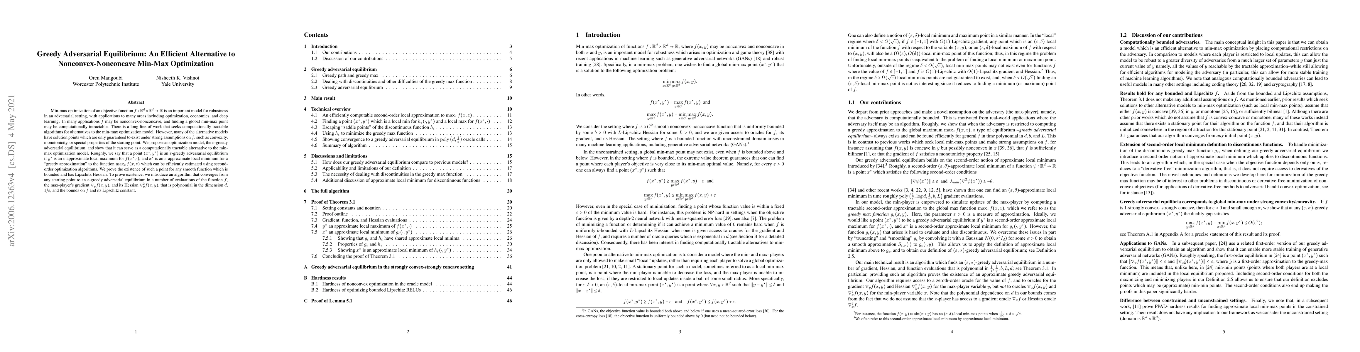 This paper proposes the $\varepsilon$-greedy adversarial equilibrium as an efficient alternative to nonconvex-nonconcave min-max optimization. It introduces an algorithm that converges to this equilibrium point, proving its existence for smooth, bounded functions with Lipschitz Hessians, and demonstrating polynomial convergence in relevant parameters.