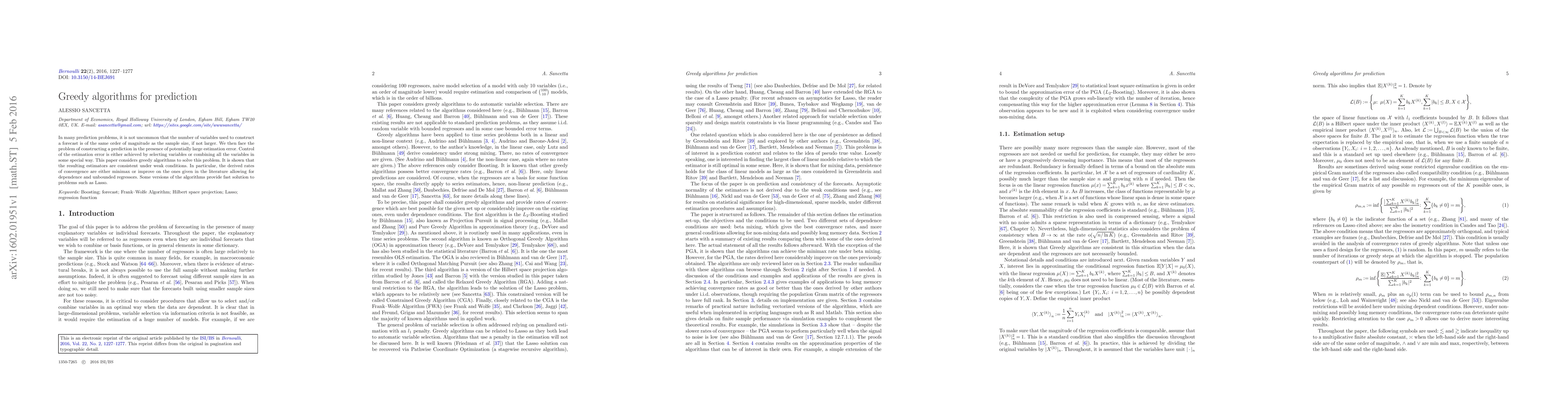 This paper introduces greedy algorithms to improve prediction accuracy in situations with many variables, showing they can achieve consistent estimators with faster convergence rates than existing methods.