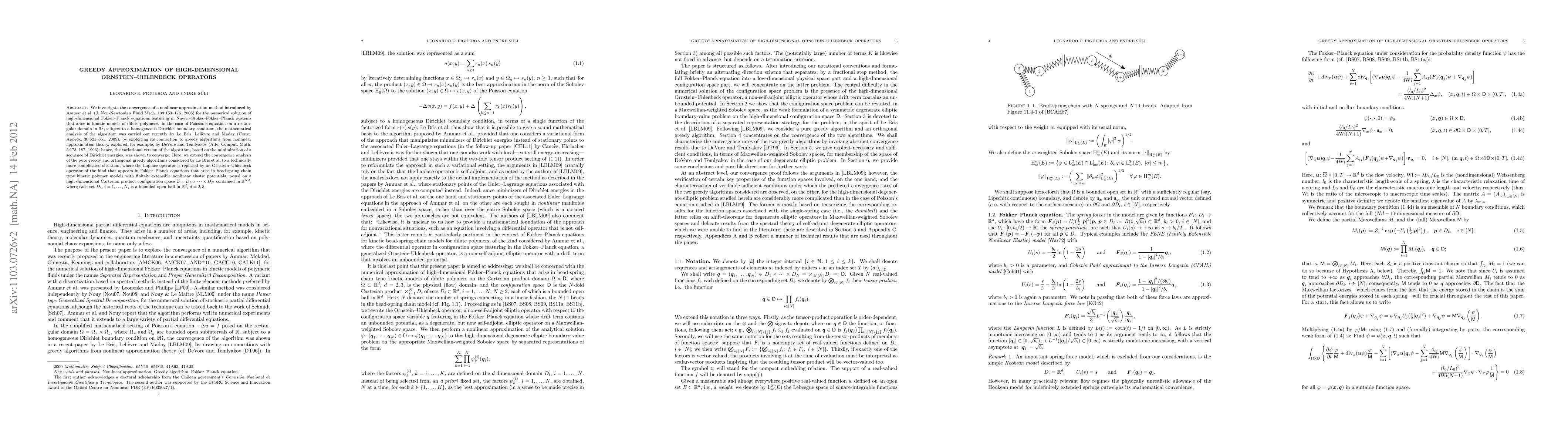 We investigate the convergence of a nonlinear approximation method introduced by Ammar et al. (J. Non-Newtonian Fluid Mech. 139:153-176, 2006) for the numerical solution of high-dimensional Fokker-Planck equations featuring in Navier-Stokes-Fokker-Planck systems that arise in kinetic models of dilute polymers. In the case of Poisson's equation on a rectangular domain in R^2, subject to a homogeneous Dirichlet boundary condition, the mathematical analysis of the algorithm was carried out recently by Le Bris, Leli\`evre and Maday (Const. Approx. 30:621-651, 2009), by exploiting its connection to greedy algorithms from nonlinear approximation theory, explored, for example, by DeVore and Temlyakov (Adv. Comput. Math. 5:173-187, 1996); hence, the variational version of the algorithm, based on the minimization of a sequence of Dirichlet energies, was shown to converge. Here, we extend the convergence analysis of the pure greedy and orthogonal greedy algorithms considered by Le Bris et al. to a technically more complicated situation, where the Laplace operator is replaced by an Ornstein-Uhlenbeck operator of the kind that appears in Fokker-Planck equations that arise in bead-spring chain type kinetic polymer models with finitely extensible nonlinear elastic potentials, posed on a high-dimensional Cartesian product configuration space D = D_1 x ... x D_N contained in R^(N d), where each set D_i, i = 1, ..., N, is a bounded open ball in R^d, d = 2, 3.