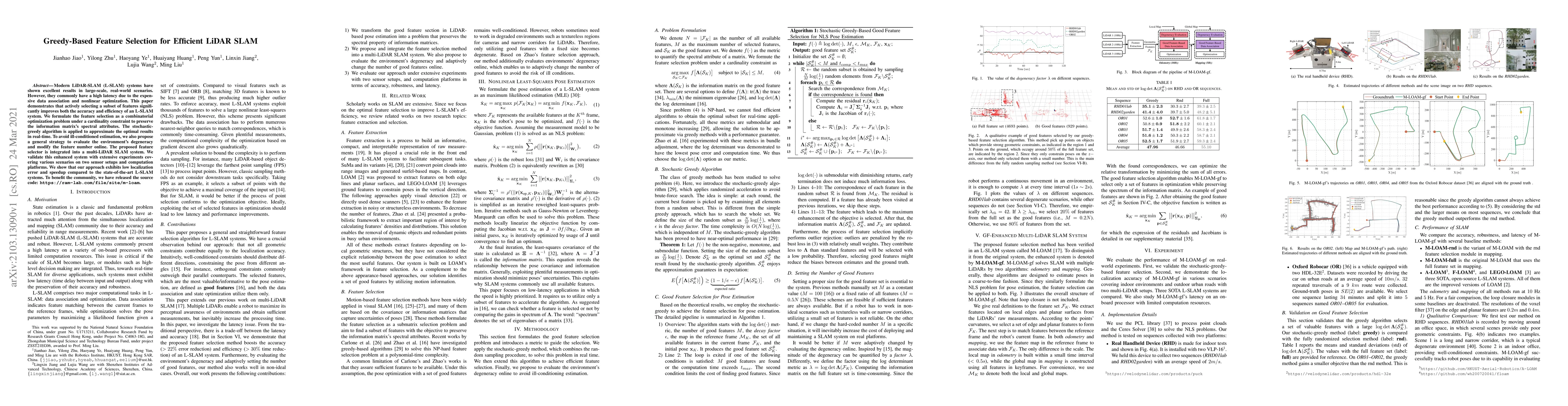 This paper proposes a greedy-based feature selection method to enhance the efficiency of LiDAR-SLAM systems, reducing latency through active feature subset selection. The approach uses a stochastic-greedy algorithm to approximate optimal feature selection while dynamically adjusting the feature count based on environmental conditions, resulting in improved accuracy and speedup over existing methods.