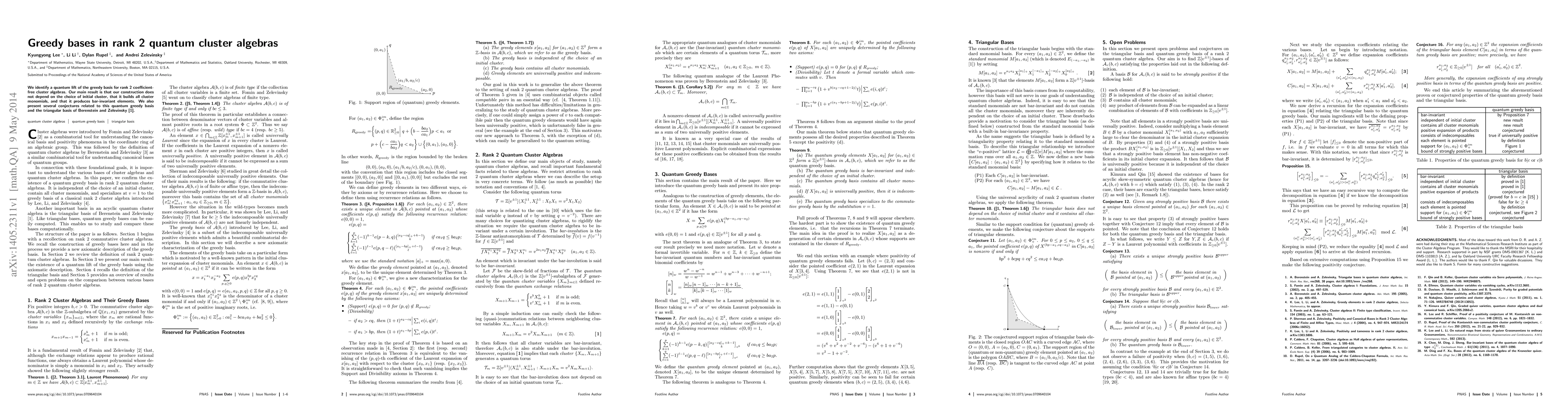 The paper identifies a quantum version of the greedy basis for rank 2 coefficient-free cluster algebras, proving its independence from initial cluster choice, comprehensive coverage of cluster monomials, and production of bar-invariant elements, along with several related conjectures.
