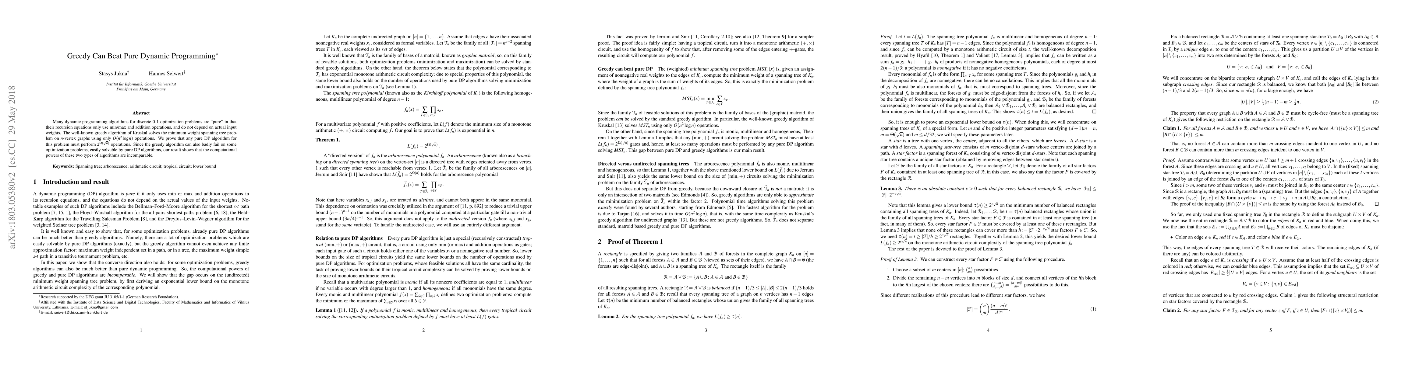 This paper demonstrates that the greedy algorithm for the minimum weight spanning tree problem outperforms any pure dynamic programming (DP) algorithm in terms of computational efficiency, requiring only $O(n^2\log n)$ operations compared to $2^{\Omega(\sqrt{n})}$ operations for pure DP algorithms. It highlights the incomparability of computational powers between greedy and pure DP approaches.