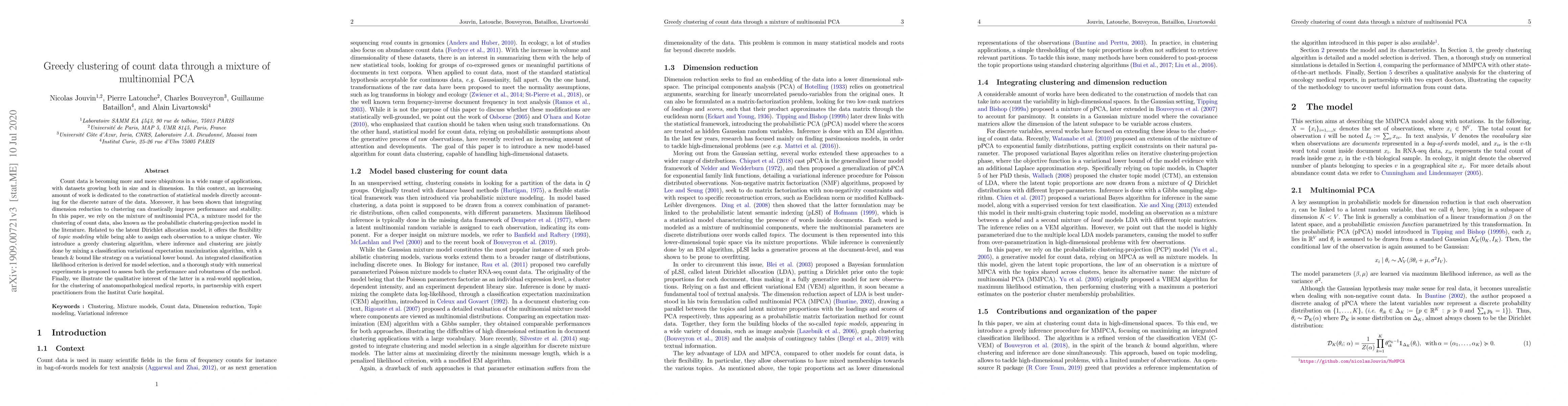 Count data is becoming more and more ubiquitous in a wide range of applications, with datasets growing both in size and in dimension. In this context, an increasing amount of work is dedicated to the construction of statistical models directly accounting for the discrete nature of the data. Moreover, it has been shown that integrating dimension reduction to clustering can drastically improve performance and stability. In this paper, we rely on the mixture of multinomial PCA, a mixture model for the clustering of count data, also known as the probabilistic clustering-projection model in the literature. Related to the latent Dirichlet allocation model, it offers the flexibility of topic modeling while being able to assign each observation to a unique cluster. We introduce a greedy clustering algorithm, where inference and clustering are jointly done by mixing a classification variational expectation maximization algorithm, with a branch & bound like strategy on a variational lower bound. An integrated classification likelihood criterion is derived for model selection, and a thorough study with numerical experiments is proposed to assess both the performance and robustness of the method. Finally, we illustrate the qualitative interest of the latter in a real-world application, for the clustering of anatomopathological medical reports, in partnership with expert practitioners from the Institut Curie hospital.