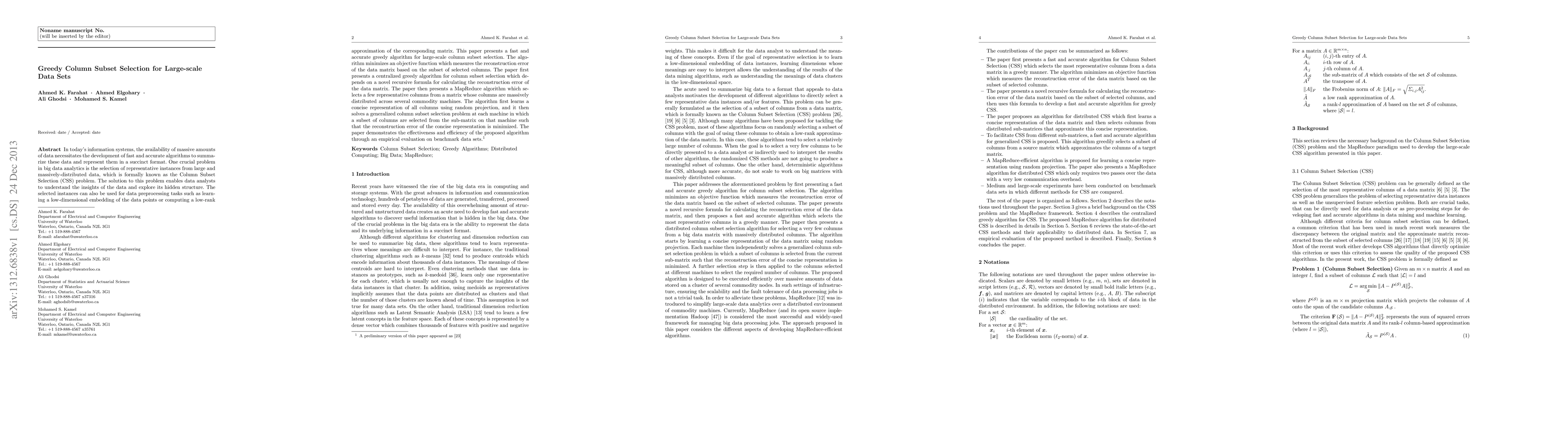 In today's information systems, the availability of massive amounts of data necessitates the development of fast and accurate algorithms to summarize these data and represent them in a succinct format. One crucial problem in big data analytics is the selection of representative instances from large and massively-distributed data, which is formally known as the Column Subset Selection (CSS) problem. The solution to this problem enables data analysts to understand the insights of the data and explore its hidden structure. The selected instances can also be used for data preprocessing tasks such as learning a low-dimensional embedding of the data points or computing a low-rank approximation of the corresponding matrix. This paper presents a fast and accurate greedy algorithm for large-scale column subset selection. The algorithm minimizes an objective function which measures the reconstruction error of the data matrix based on the subset of selected columns. The paper first presents a centralized greedy algorithm for column subset selection which depends on a novel recursive formula for calculating the reconstruction error of the data matrix. The paper then presents a MapReduce algorithm which selects a few representative columns from a matrix whose columns are massively distributed across several commodity machines. The algorithm first learns a concise representation of all columns using random projection, and it then solves a generalized column subset selection problem at each machine in which a subset of columns are selected from the sub-matrix on that machine such that the reconstruction error of the concise representation is minimized. The paper demonstrates the effectiveness and efficiency of the proposed algorithm through an empirical evaluation on benchmark data sets.