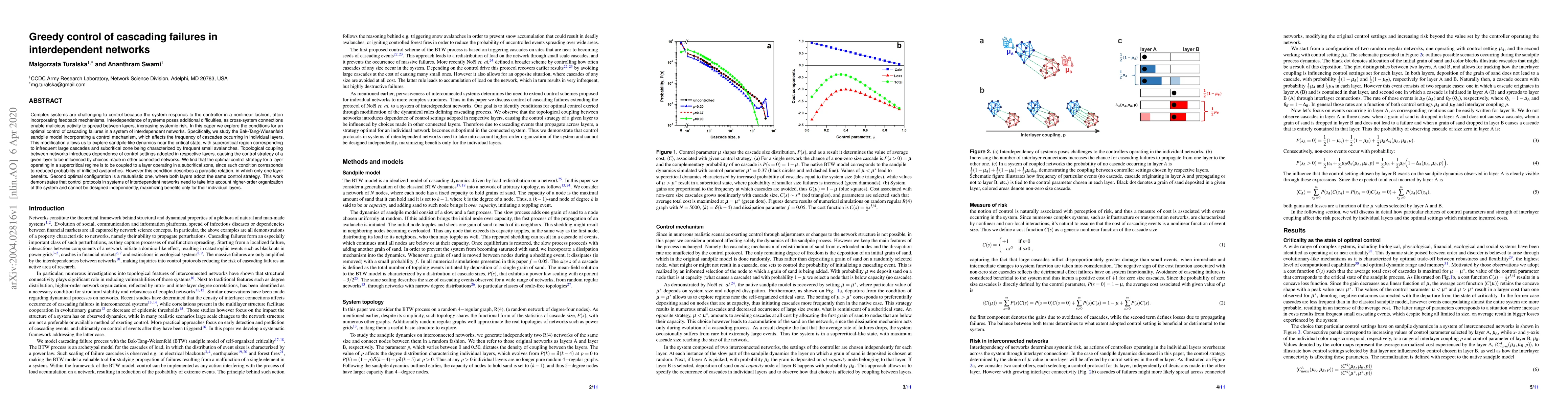 This paper investigates optimal control strategies for mitigating cascading failures in interdependent networks using a modified Bak-Tang-Wiesenfeld sandpile model. The study finds that the best control configuration involves coupling a supercritical layer to a subcritical one, though this creates a parasitic relationship. The second best strategy is mutualistic, where both layers use the same control strategy, highlighting the need for integrated control protocols across interconnected networks.
