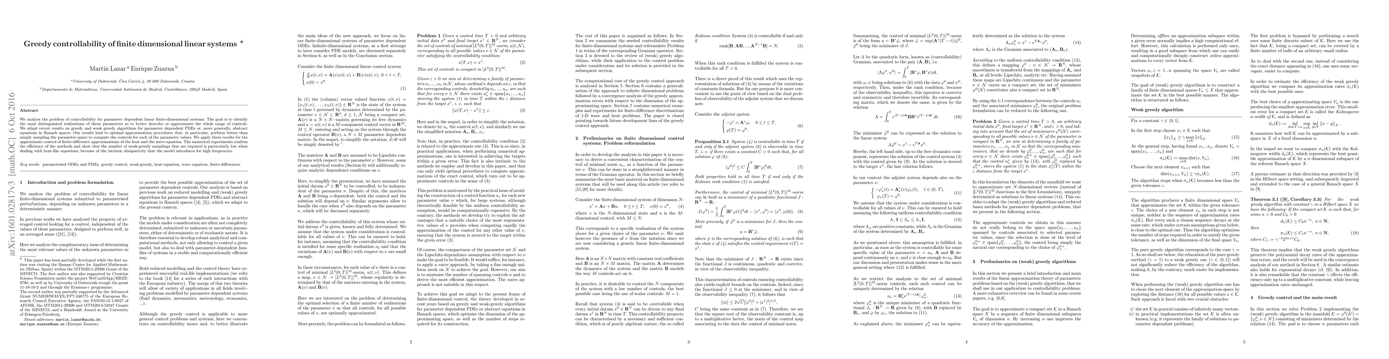 We analyse the problem of controllability for parameter-dependent linear finite-dimensional systems. The goal is to identify the most distinguished realisations of those parameters so to better describe or approximate the whole range of controls. We adapt recent results on greedy and weak greedy algorithms for parameter depending PDEs or, more generally, abstract equations in Banach spaces. Our results lead to optimal approximation procedures that, in particular, perform better than simply sampling the parameter-space to compute the controls for each of the parameter values. We apply these results for the approximate control of finite-difference approximations of the heat and the wave equation. The numerical experiments confirm the efficiency of the methods and show that the number of weak-greedy samplings that are required is particularly low when dealing with heat-like equations, because of the intrinsic dissipativity that the model introduces for high frequencies.