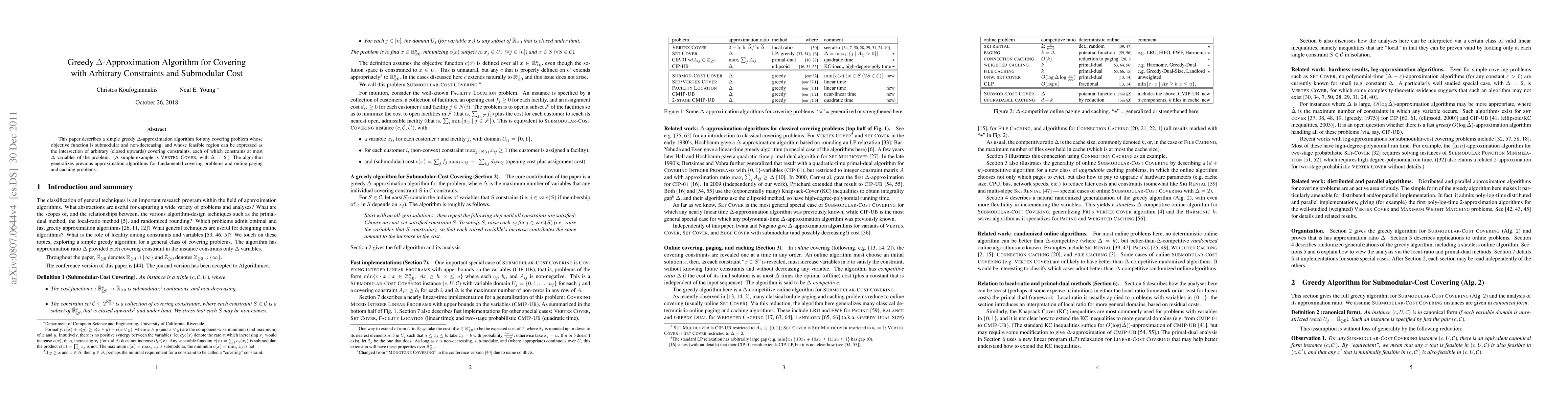 This paper presents a greedy D-approximation algorithm for covering problems with submodular costs and arbitrary constraints, generalizing previous methods for fundamental problems like Vertex Cover. The algorithm efficiently handles constraints that affect at most D variables.