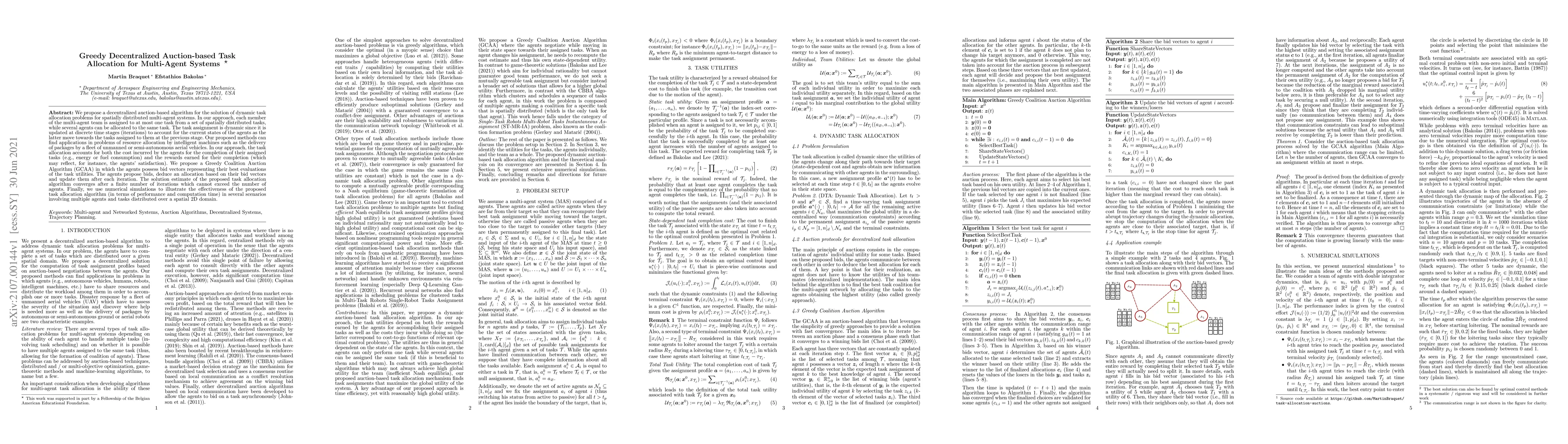 The paper introduces the Greedy Coalition Auction Algorithm (GCAA), a decentralized auction-based method for dynamic task allocation in multi-agent systems that efficiently converges within a finite number of iterations.