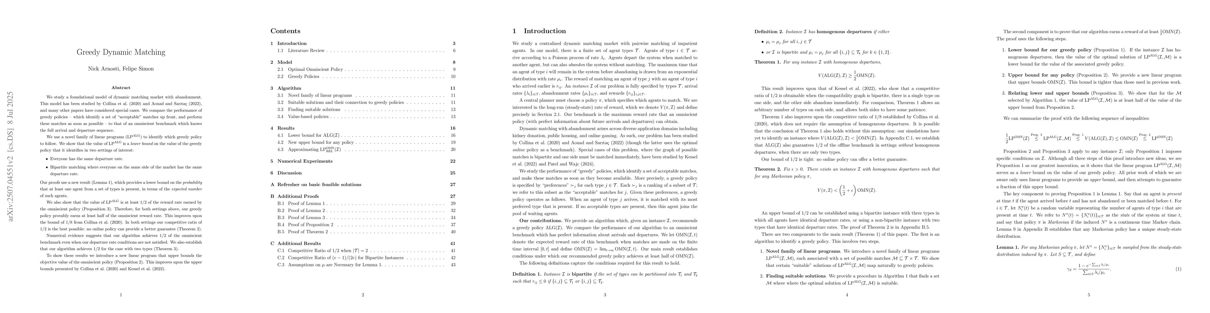 We study a foundational model of dynamic matching market with abandonment. This model has been studied by Collina et al (2020) and Aouad and Saritac (2022), and many other papers have considered special cases. We compare the performance of greedy policies -- which identify a set of "acceptable" matches up front, and perform these matches as soon as possible -- to that of an omniscient benchmark which knows the full arrival and departure sequence. We use a novel family of linear programs ($LP^{ALG}$) to identify which greedy policy to follow. We show that the value of $LP^{ALG}$ is a *lower bound* on the value of the greedy policy that it identifies in two settings of interest: -When all types have the same departure rate. -The bipartite case where types on the same side of the market have the same departure rate. The proofs of these results use a new result (Lemma 1), which relates the *probability* that at least one agent from a set of types is present in the system to the expected number of such agents. We also show that the value of $LP^{ALG}$ is at least 1/2 of the reward rate earned by the omniscient policy (Proposition 4). Therefore, for both settings above, our greedy policy provably earns at least half of the omniscient reward rate. This improves upon the bound of 1/8 from Collina (2020). In both settings our competitive ratio of 1/2 is the best possible: no online policy can provide a better guarantee (Theorem 2). To show these results we introduce a new linear program that upper bounds the objective value of the omniscient policy (Proposition 3). This improves upon the upper bounds presented by Collina et al (2020) and Kessel et al (2022).