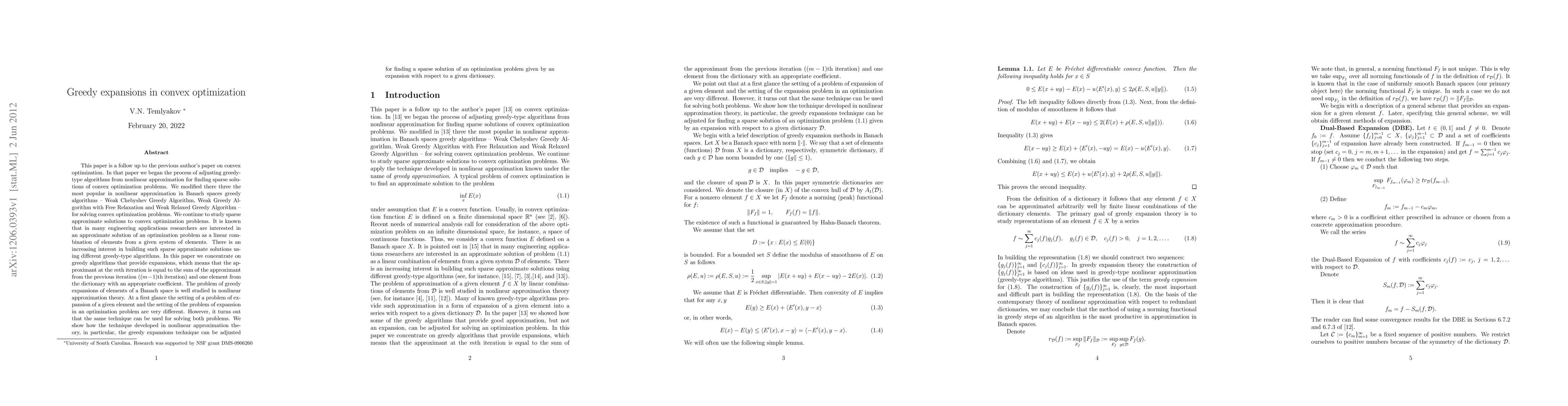 This paper extends previous work on modifying greedy algorithms for solving convex optimization problems by focusing on greedy expansions. It adapts techniques from nonlinear approximation theory to develop sparse approximate solutions for optimization problems, demonstrating that the same method can be used for both expansion problems and optimization problems.