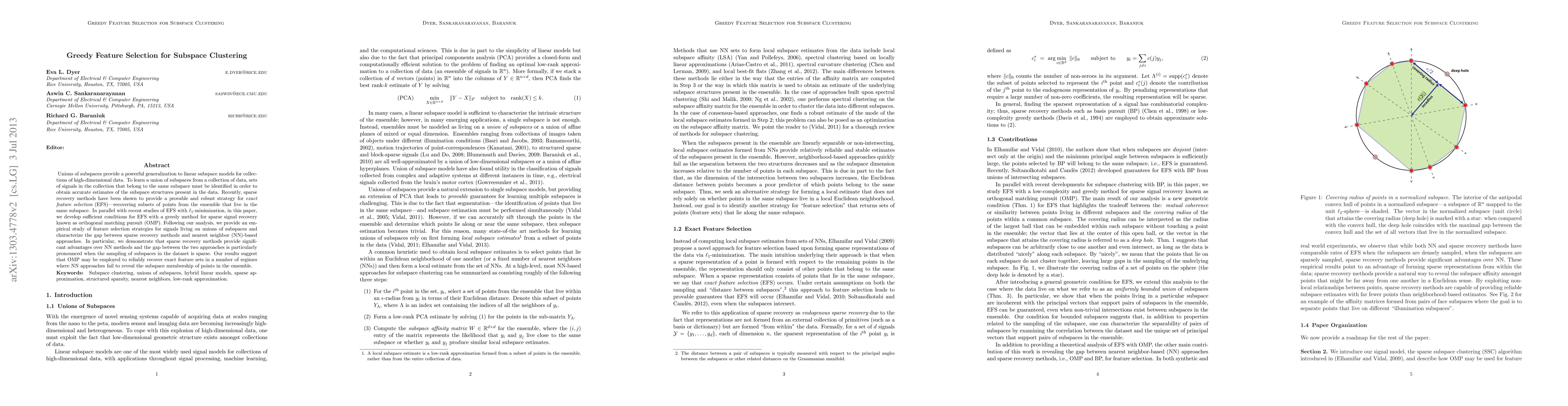 This paper develops sufficient conditions for exact feature selection using the greedy orthogonal matching pursuit (OMP) method for sparse signal recovery in unions of subspaces. It demonstrates that OMP outperforms nearest neighbor approaches, especially in sparse sampling scenarios, suggesting its reliability in revealing subspace membership.