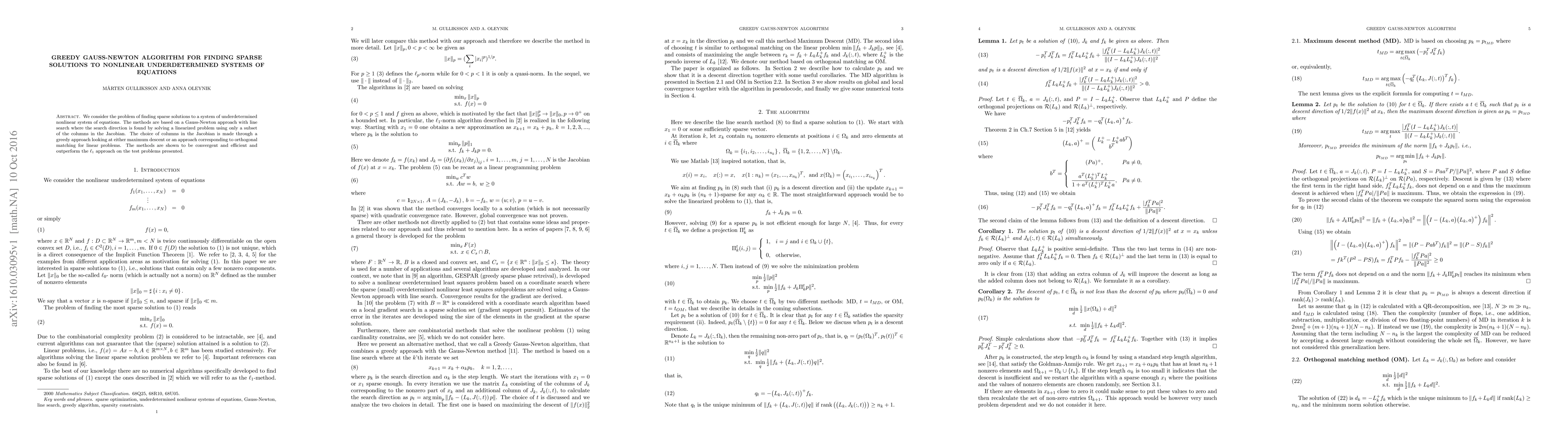 This paper proposes a Greedy Gauss-Newton algorithm for finding sparse solutions to nonlinear underdetermined systems, utilizing a subset of Jacobian columns selected via a greedy approach for maximum descent or orthogonal matching. The method is shown to converge efficiently and outperform the $\ell_1$ approach in tests.