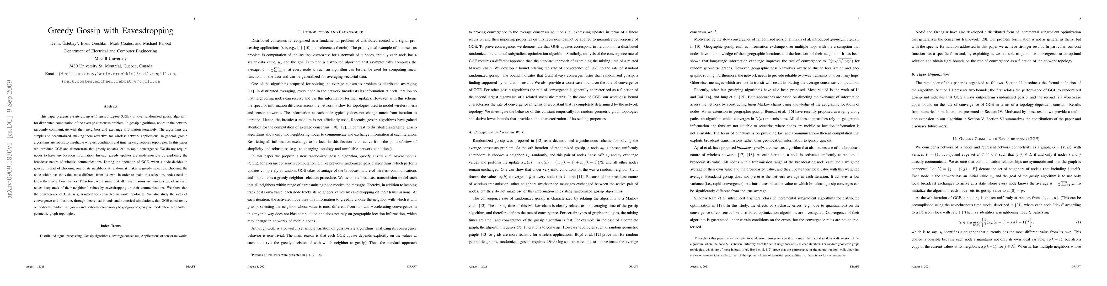 This paper introduces greedy gossip with eavesdropping (GGE), a decentralized algorithm for computing average consensus in wireless networks. GGE selects neighbors based on the most differing values to achieve rapid convergence without requiring location information, leveraging wireless eavesdropping for neighbor value tracking.