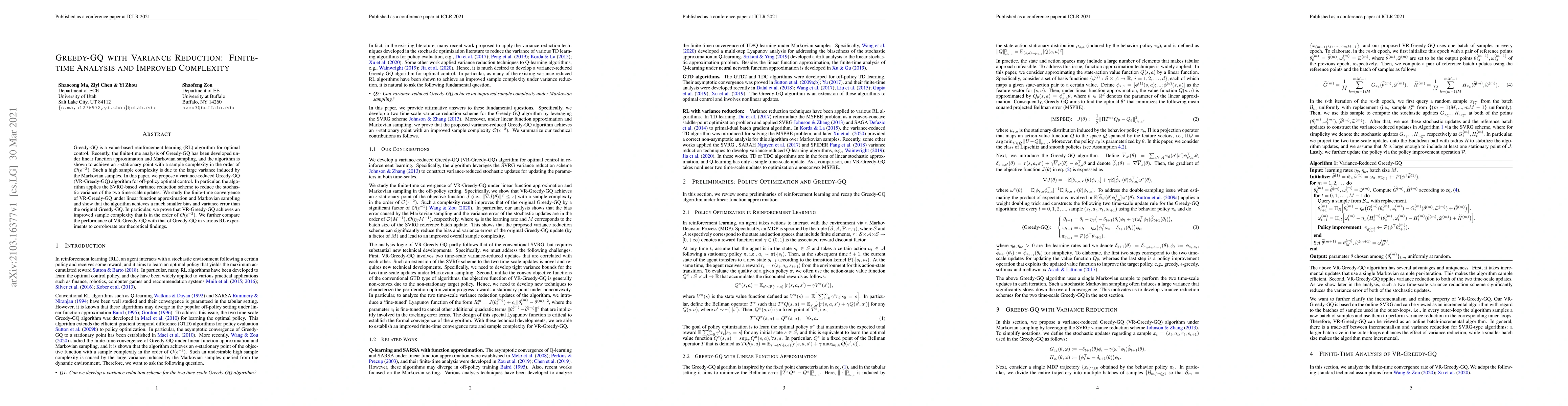 This paper proposes a variance-reduced Greedy-GQ (VR-Greedy-GQ) algorithm to improve the sample complexity of the original Greedy-GQ RL algorithm. The VR-Greedy-GQ achieves an improved sample complexity of $\mathcal{O}(\epsilon^{-2})$ compared to the original's $\mathcal{O}(\epsilon^{-3})$, demonstrating better performance in off-policy optimal control.