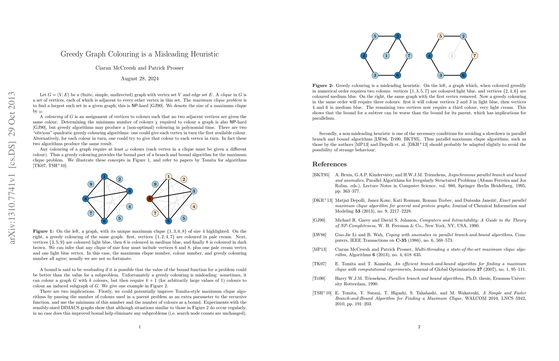 Summary: This paper demonstrates that greedy graph colouring, commonly used as a bound in maximum clique algorithms, can be misleading, thereby undermining its effectiveness in parallel branch and bound methods.