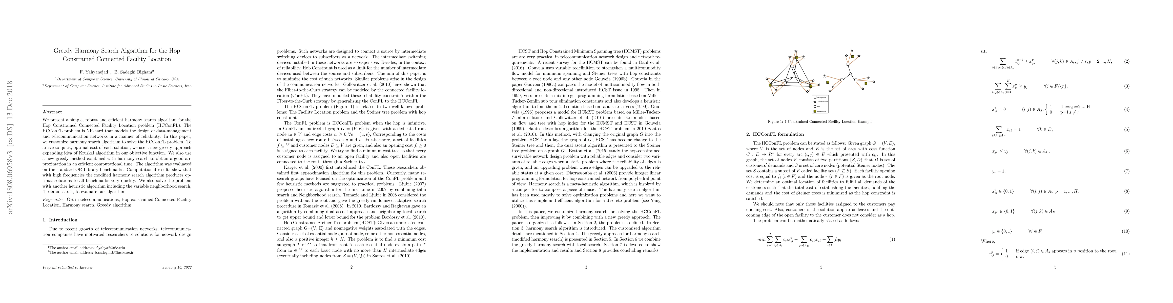This paper proposes a modified harmony search algorithm to efficiently solve the NP-hard Hop Constrained Connected Facility Location problem, incorporating a greedy approach inspired by Kruskal's algorithm. The algorithm was benchmarked against standard datasets and outperformed other heuristic methods, achieving optimal solutions quickly.