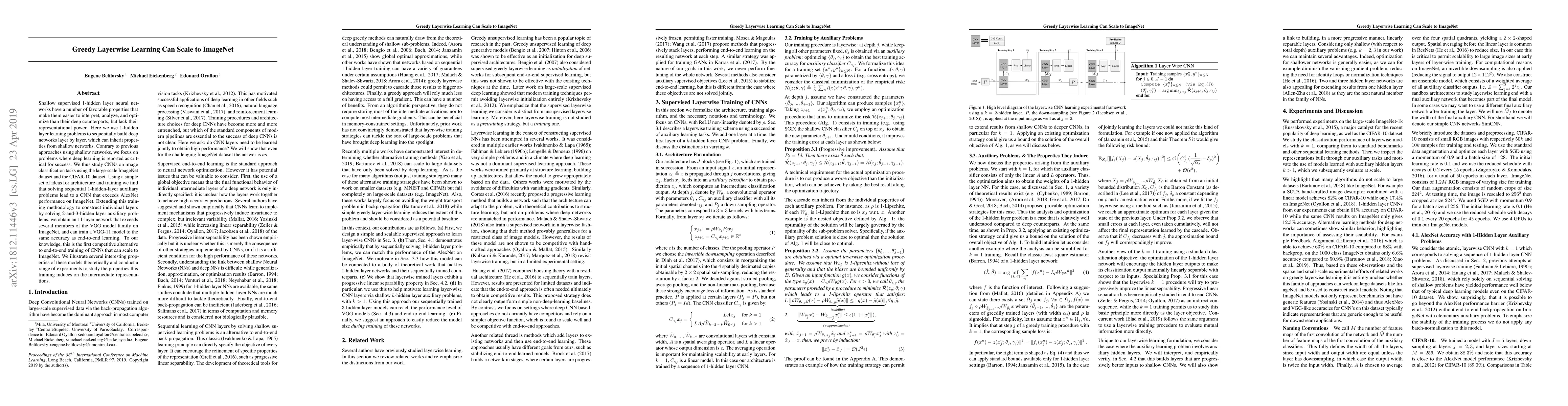 Shallow supervised 1-hidden layer neural networks have a number of favorable properties that make them easier to interpret, analyze, and optimize than their deep counterparts, but lack their representational power. Here we use 1-hidden layer learning problems to sequentially build deep networks layer by layer, which can inherit properties from shallow networks. Contrary to previous approaches using shallow networks, we focus on problems where deep learning is reported as critical for success. We thus study CNNs on image classification tasks using the large-scale ImageNet dataset and the CIFAR-10 dataset. Using a simple set of ideas for architecture and training we find that solving sequential 1-hidden-layer auxiliary problems lead to a CNN that exceeds AlexNet performance on ImageNet. Extending this training methodology to construct individual layers by solving 2-and-3-hidden layer auxiliary problems, we obtain an 11-layer network that exceeds several members of the VGG model family on ImageNet, and can train a VGG-11 model to the same accuracy as end-to-end learning. To our knowledge, this is the first competitive alternative to end-to-end training of CNNs that can scale to ImageNet. We illustrate several interesting properties of these models theoretically and conduct a range of experiments to study the properties this training induces on the intermediate layers.