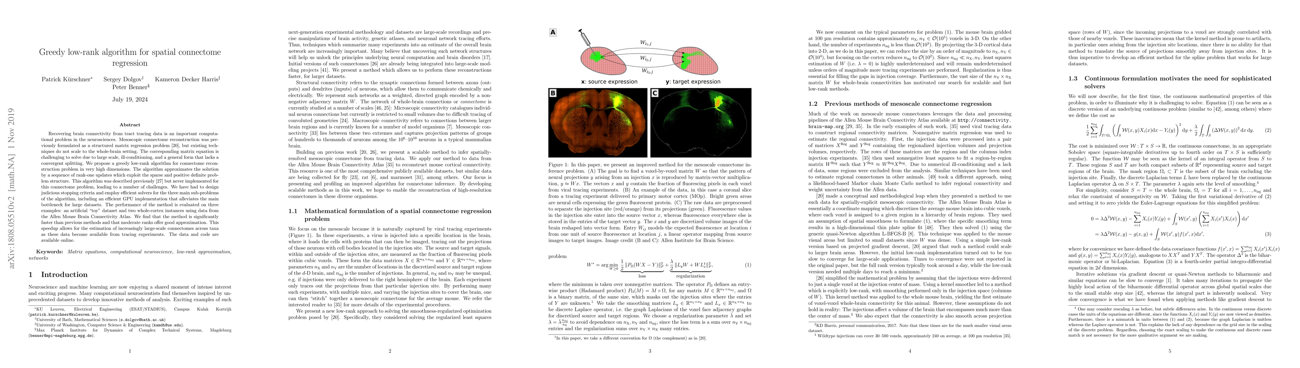 This paper proposes a novel greedy low-rank algorithm to efficiently reconstruct brain connectivity from tract tracing data, addressing the scalability issues of existing methods. The algorithm leverages rank-one updates and efficient GPU implementations to achieve significant speedups, demonstrated on both artificial and real datasets from the Allen Mouse Brain Connectivity Atlas.