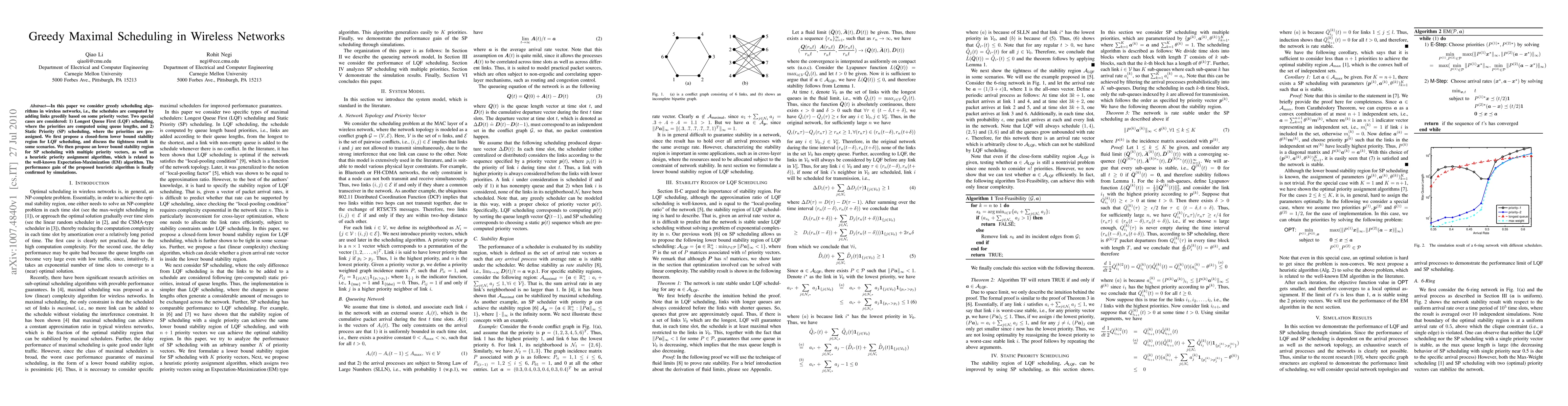 This paper explores greedy scheduling algorithms in wireless networks, focusing on Longest Queue First (LQF) and Static Priority (SP) scheduling. It proposes closed-form stability regions for LQF and a lower bound for SP, along with a heuristic priority assignment algorithm inspired by the Expectation-Maximization algorithm, demonstrating its performance benefits through simulations.