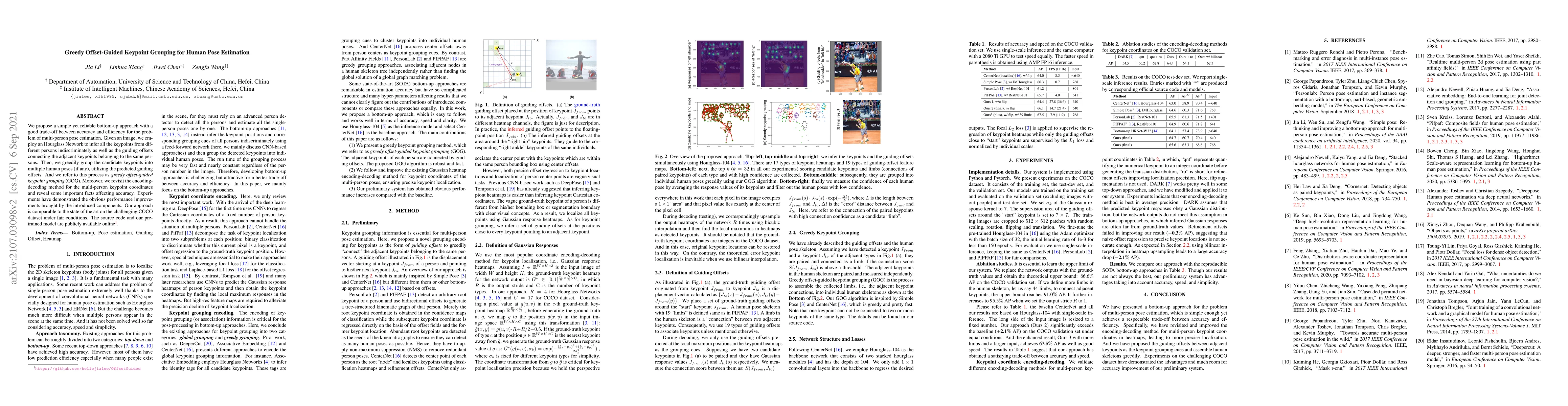 This paper introduces a bottom-up approach for multi-person pose estimation using an Hourglass Network to infer keypoints and guiding offsets, followed by greedy offset-guided keypoint grouping (GOG) to form human poses. The method shows significant performance improvements and competitive results on the COCO dataset.